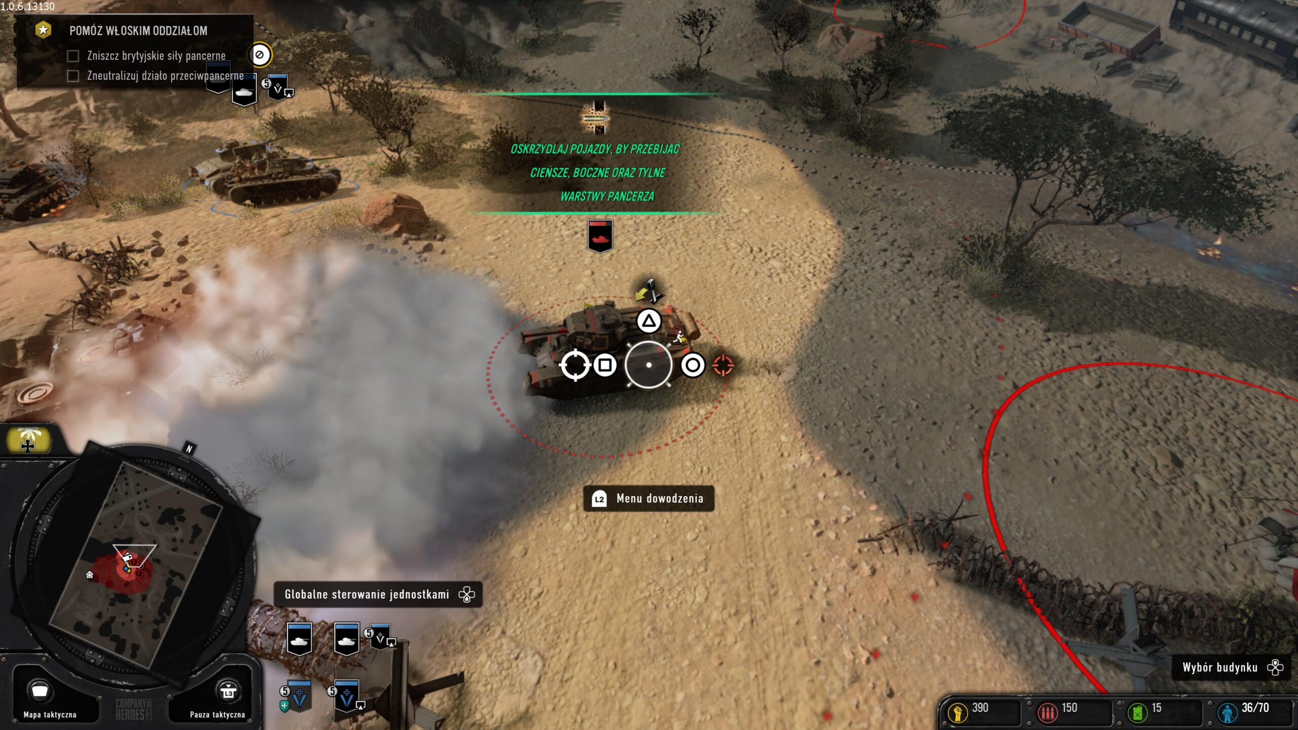 Osobiście nie mam z tym problemu. Lubię bitwy pancerne, aczkolwiek rozumiem, że nie każdemu taka forma rozgrywki może się spodobać. Tu warto dodać, że pojazdy w końcu maja swoje słabe punkty. Strzelając w bok lub tył czołgu szybciej go zniszczymy niż w przypadku, w którym mieliśmy robić to od frontu. Warto też zaznaczyć, że w Company of Heroes 3 jest cała masa różnych pojazdów. Od potężnych niszczycieli czołgów przez ośmiokołowe samochody opancerzone, ciężarówki i transportery medyczne lub z zaopatrzeniem po dyskretne pojazdy zwiadowcze. Operacje w Afryce w pierwszych etapach to głównie misje oparte na samouczkach. Nauczymy się tam produkcji jednostek, flankowania nieprzyjaciela, rzucania granatów, czy naprawy uszkodzonych pojazdów.