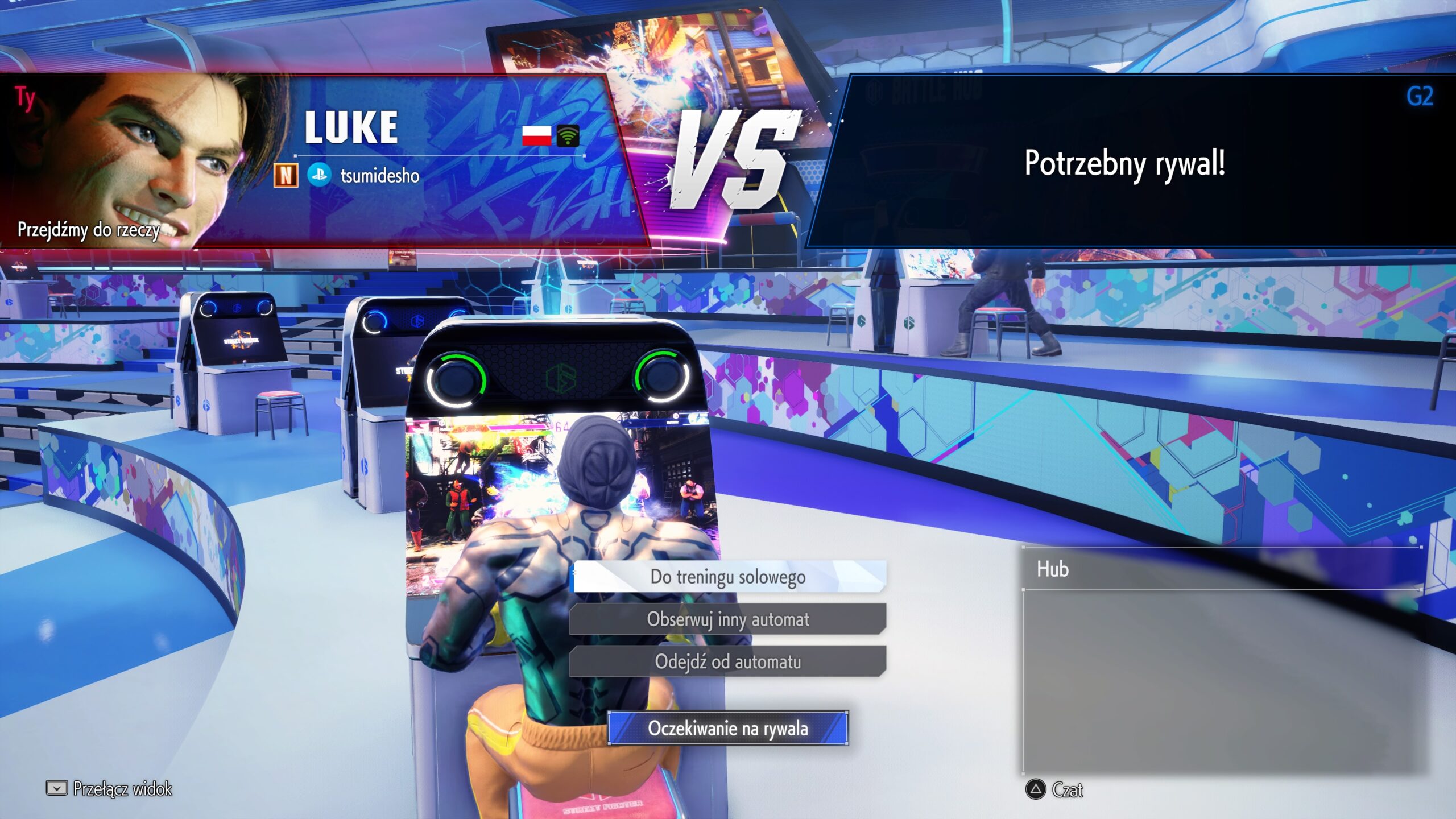Co zatem dzieje się w Battle Hub? Tryb ten został stworzony z myślą o użytkownikach, którzy mocno cenią sobie wspólną zabawę online z innymi graczami z całego świata. Poruszamy się po nim naszą stworzoną postacią i otrzymujemy możliwość walki w czasowych turniejach i wyzwaniach. Możemy również zaprosić poznane w Battle Hubie osoby do rywalizacji przy widocznych automatach inspirowanych klasycznymi odsłonami serii Street Fighter. Prezentuje się to znakomicie, natomiast niestety, ale po pierwszym otrzymanym łomocie chyba więcej się tam nie pojawię, bo nie widzę większego sensu stawania się workiem treningowym dla wprawionych graczy.