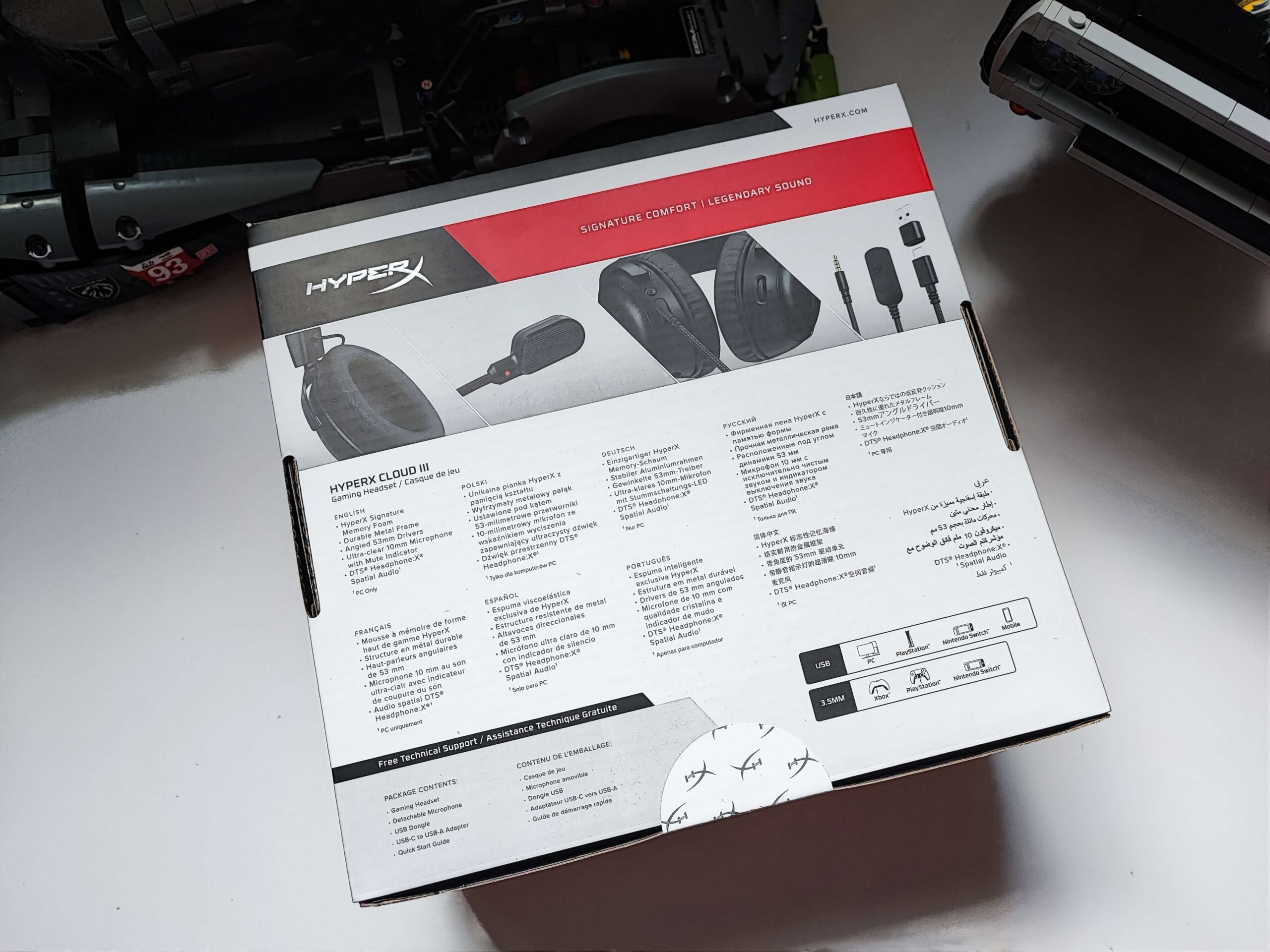Słuchawki zapakowano w charakterystyczne dla firmy HyperX czerwono-białe pudełko. Co ciekawe na froncie znalazł się napis “Legendary Sound”, który informuje fanów HyperX-a, że nadal będą mieli do czynienia z tym samym lub być może lepszym dźwiękiem. Podobnie jak poprzednie modele z tej serii, również HyperX Cloud III są słuchawkami przewodowymi, które zakończono wtyczką jack 3.5 mm. Jednak w pudełku znajdziemy jeszcze kabel z adapterami USB-A i USB-C. Dostępne metody podłączenia to: