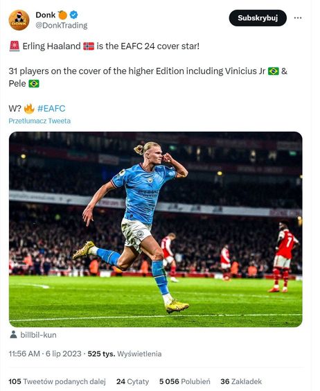 Popularny informator – Donk, który od wielu lat przynosi fanom wirtualnej piłki nożnej newsy, ma dziś dobre informacje dla fanów Premier League. Gwiazdą okładki EA Sports FC 24 zostanie supersnajper Manchesteru City – Erling Haaland. Norweg ma za sobą fantastyczny pierwszy sezon w lidze angielskiej. Strzelił 36 goli w 35 w Premier League, natomiast w 11 meczach Ligi Mistrzów zdobył aż 12 bramek. Podobnie jak w przypadku poprzednich tytułów z serii FIFA, prawdopodobnie w EA FC 24 zobaczymy Edycję Standardową oraz Ultimate. Nawet 31 zawodników może trafić na okładki bogatszej edycji, w tym Vinicius Jr i Pele – twierdzi Donk.