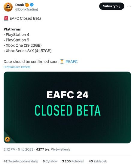 Inne dosyć wiarygodne źródło donosi o wycieku daty premiery EA Sports FC 24. Jest nim Billbil-kun, który wcześniej ujawnił trafne informacje o Mortal Kombat 1 przed oficjalnymi ogłoszeniami. Do tego jako pierwszy ujawnił gry PS Plus na lipiec przed ich oficjalną premierą. Billbil-kun uważa, że premiera gry odbędzie się w dniu 29 września 2023 roku, co ciekawe Edycja Ultimate pozwoli zagrać już od 22 września. Czyli nie trzy dni wcześniej, jak to miało miejsce w przypadku serii FIFA, ale aż siedem dni przed oficjalną premierą. Podobno od 22 września dostępna będzie także dziesięciogodzinna wersja próbna gry, oczywiście dla wszystkich członków EA Play.