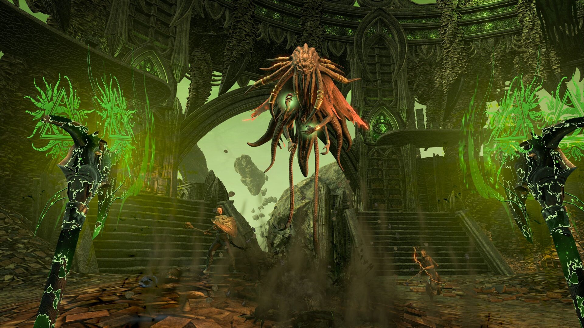 Dla graczy powracających jedną z najciekawszych nowości będzie z pewnością nowa klasa postaci. Ostatnią nową klasą dodaną do gry był nekromanta dorzucony w dodatku Elsweyr. Dopiero po 4 latach Necrom przynosi nam świeżą mechanikę w postaci arkanisty. Otrzymujemy wraz z nią nowe umiejętności i typowo magiczne drzewka rozwoju postaci. Jest w nich możliwość podziału rozwoju skupiającego się na ataku, obronie czy leczeniu. Ja sprawdziłem wersję postaci zadającej obrażenia i zarówno strona wizualna, jak i odczucia z rozgrywki sprawiały pozytywne wrażenia. Szczególnie ciekawie wypadło udźwiękowienie umiejętności. Niestety o zadawanych obrażeniach czy przeżywalności nie będę tutaj wspominał. Od wielu lat w każdej recenzji narzekam niestety na system skalowania świata do poziomu postaci. Tym razem po prostu ten temat pominę, a zainteresowani znajdą bardziej rozbudowane informacje na ten temat we wcześniejszych recenzjach. Tak więc nowa postać bazuje na magii, a wszelkie efekty wizualne zostały połączone z ciekawymi animacjami i dużą dawką widocznej „zieleni”. Oczywiście pasuje to do klimatu nowego dodatku. Klasa jest dynamiczna i czuć w niej powiew świeżości w odniesieniu do starszych klas z nieco już nudnymi animacjami.