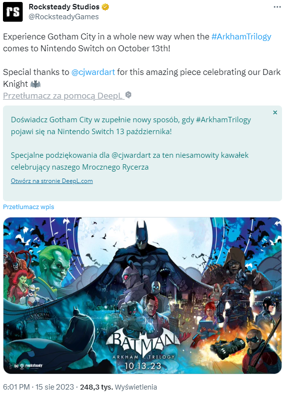 A teraz dowiedzieliśmy się wreszcie kiedy to nastąpi. Jak mogliśmy wyczytać na oficjalnym profilu Rocksteady na Twitterze, zestaw z Batmanem w roli głównej trafi do nas już 13 października: