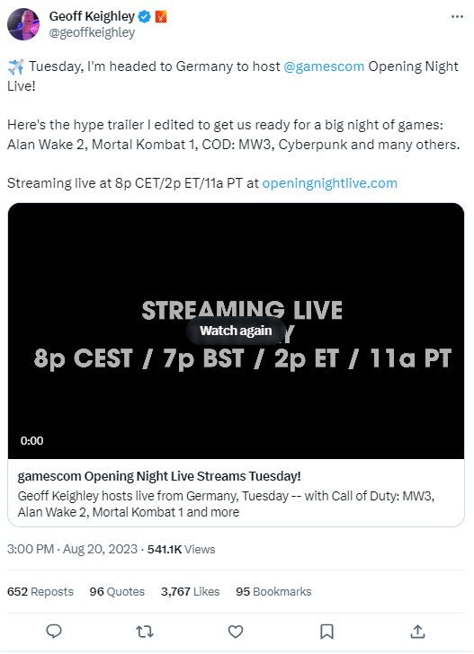 Informacja pojawiła się na oficjalnym profilu Geoffa. Spodziewamy się więc ogłoszenia nowych materiałów i informacji między innymi na temat: Alana Wake 2, Mortal Kombat 1, Call of Duty: Modern Warfare 3 oraz dodatku do Cyberpunk. Jak zawsze, pojawią się też nigdy wcześniej niezapowiadane gry!
