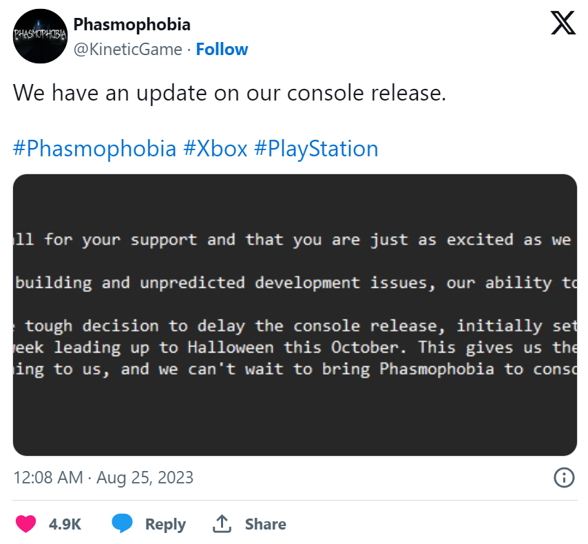 W okolicach tegorocznego “E3” dostaliśmy pierwszą oficjalną zapowiedź Phasmophobia na konsolach. Wspierajacy pełny crossplay (nawet z VR) tytuł, miał pojawić się w ramach wczesnego dostępu w sierpniu. Niestety, twórcy ogłosili opóźnienie. Winny jest pożar w biurze, który stanął na drodze porządnego testowania gry oraz “nieprzewidziane problemy”.