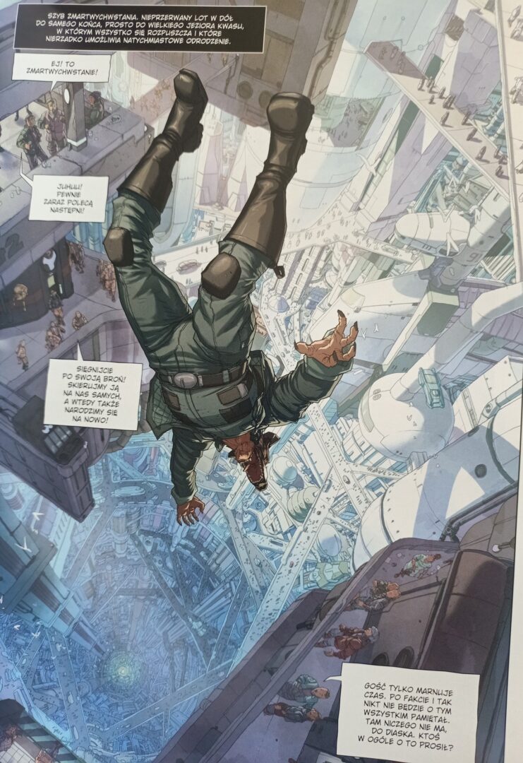 Na szczególną uwagę zasługują świetne rysunki Pete’a Woodsa. Dzięki szczegółowej kresce jeszcze dokładniej niż klasyczne komiksy pokazują Miasto-Szyb oraz jego okolice. Autor posługuje się technikami komputerowymi, ale efekty specjalne w postaci rozmycia i rozświetleń stosuje na szczęście bardzo oszczędnie. Widać tu bardzo przemyślane kadrowanie oraz częste łamanie schematu układu kafli z obrazkami. To jeden z ładniej wyglądających komiksów, jakie widziałem. Jeśli pozostałe historie z uniwersum Incala prezentują taki poziom, nie potrzebuję dodatkowych zachęt, aby zacząć je dokładnie śledzić i Was również do tego zachęcam!