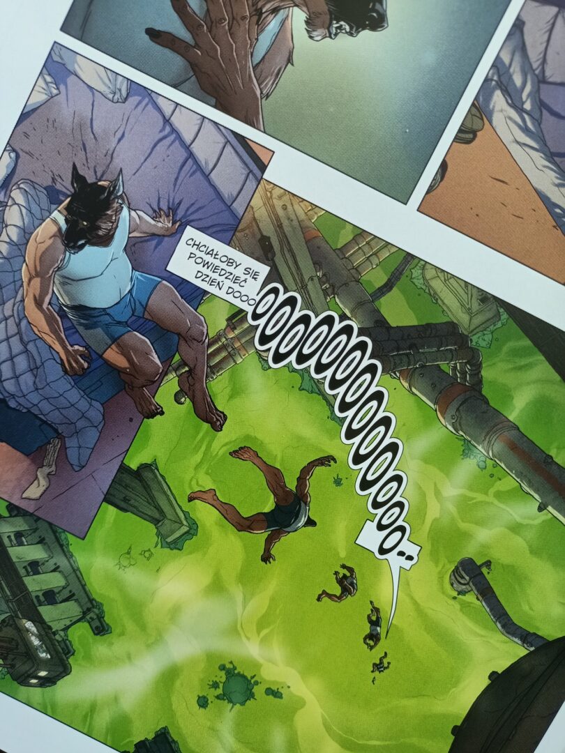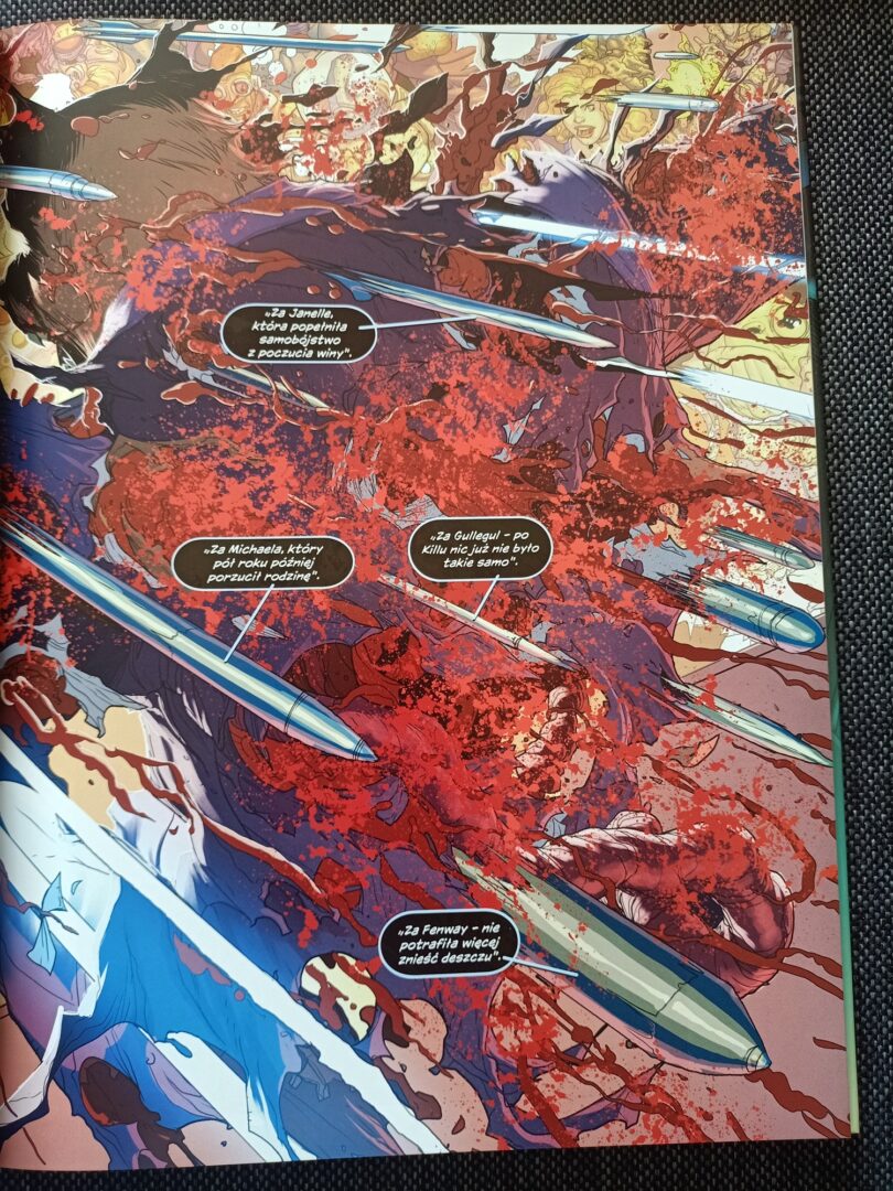 Dlaczego tak bardzo spodobały mi się prace Woodsa? Charakteryzują je cienkie, wyraźne kontury, ciekawe perspektywy kadrów i genialne kolory. Widać, że artysta korzysta też z efektów komputerowych, jak rozmycie albo efekty świetlne. To z pewnością dzieło, które w przeważającej mierze po naszkicowaniu powstało w komputerze. Nieraz zdarza się, że kadry nachodzą na siebie, niektóre umieszczone są na spad, a innym razem w ogóle nie ma marginesów, ponieważ dostajemy obraz wypełniający całe strony. Trudno to wytłumaczyć, ale wraz z dosyć zwariowanym scenariuszem, sprawiało to wrażenie pewnego obłędu — co na pewno było zamierzone. Oprócz zdjęć komiksu zachęcam Was do zapoznania się z kreską artysty na jego profilu Instagram.