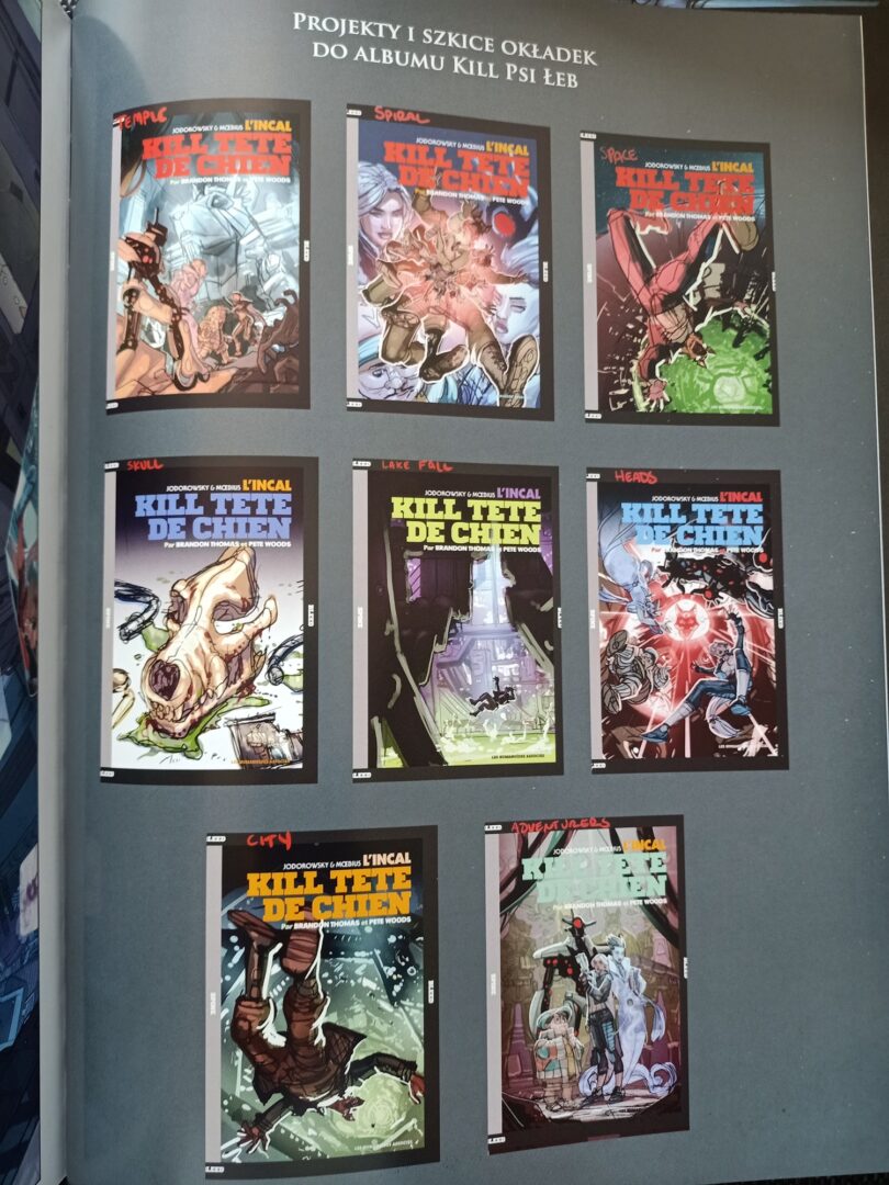 Kill Psi Łeb jest wydany w powiększonym formacie 240 × 320 mm, w twardej oprawie i na świetnej jakości kredowym papierze. Rozmiar stron w Przed Incalem a tym komiksem są różne, czyli publikacje nie będą się jednolicie prezentować na półce. Niemniej, jeśli aspekty kolekcjonerskie odłożymy na bok, to czytało się go bardzo dobrze właśnie w takim wydaniu. Szczególnie że nie raz zatrzymywałem się, aby podziwiać detale rysunków Peta Woodsa. Trochę szkoda, że dostaliśmy mało materiałów dodatkowych — możemy zapoznać się z projektami okładek poszczególnych zeszytów składających się na ten album.