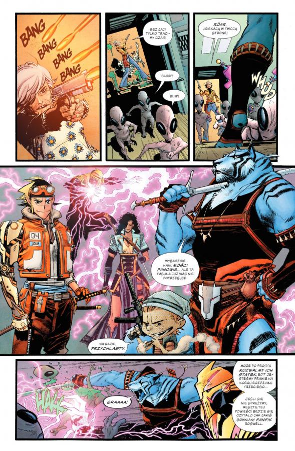 Pora przejść jednak do komiksu… szybko poznajemy w nim tytułową grupę Plot Holes, która odpowiedzialna jest za edycję fabuły powieści przed jej wydaniem. Proces ten w tym wypadku nie polega na wykasowaniu zbędnych akapitów. Przykładowo, jeśli wątek tandetnych obcych psuje powieść, nasza grupa musi ich unicestwić przy pomocy arsenału broni palnej i szpad.