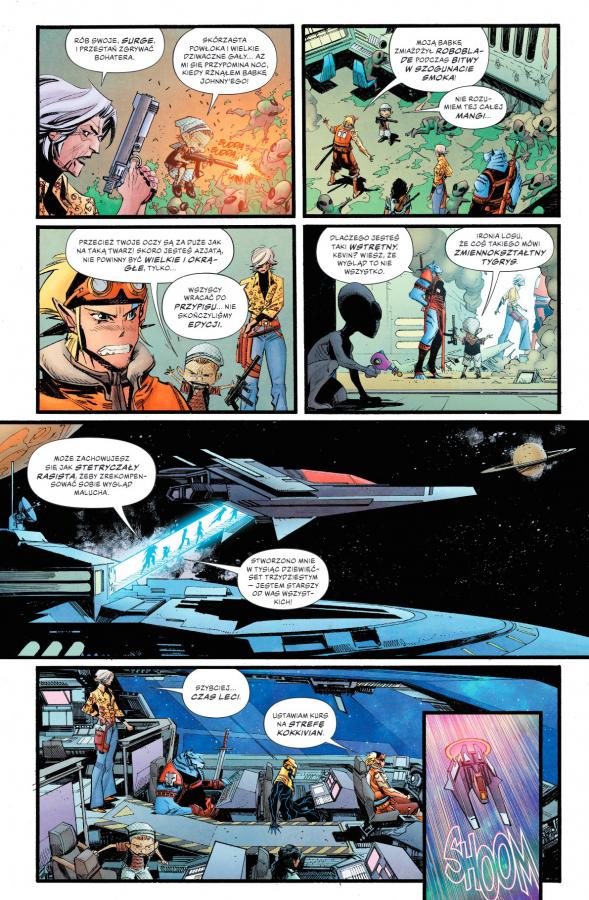 I nie kończy się to na samym projekcie postaci. Podczas retrospekcji Johny’ego dostajemy bardzo intensywną historię z charakterystycznymi mangowymi kadrami. Wspomnienia Kevina naprawdę przypominają wczesne paski komiksowe, a retrospekcje antybohatera Surge’a obfitują w fatalne dialogi, których pełno w superbohaterskich akcyjniakach.