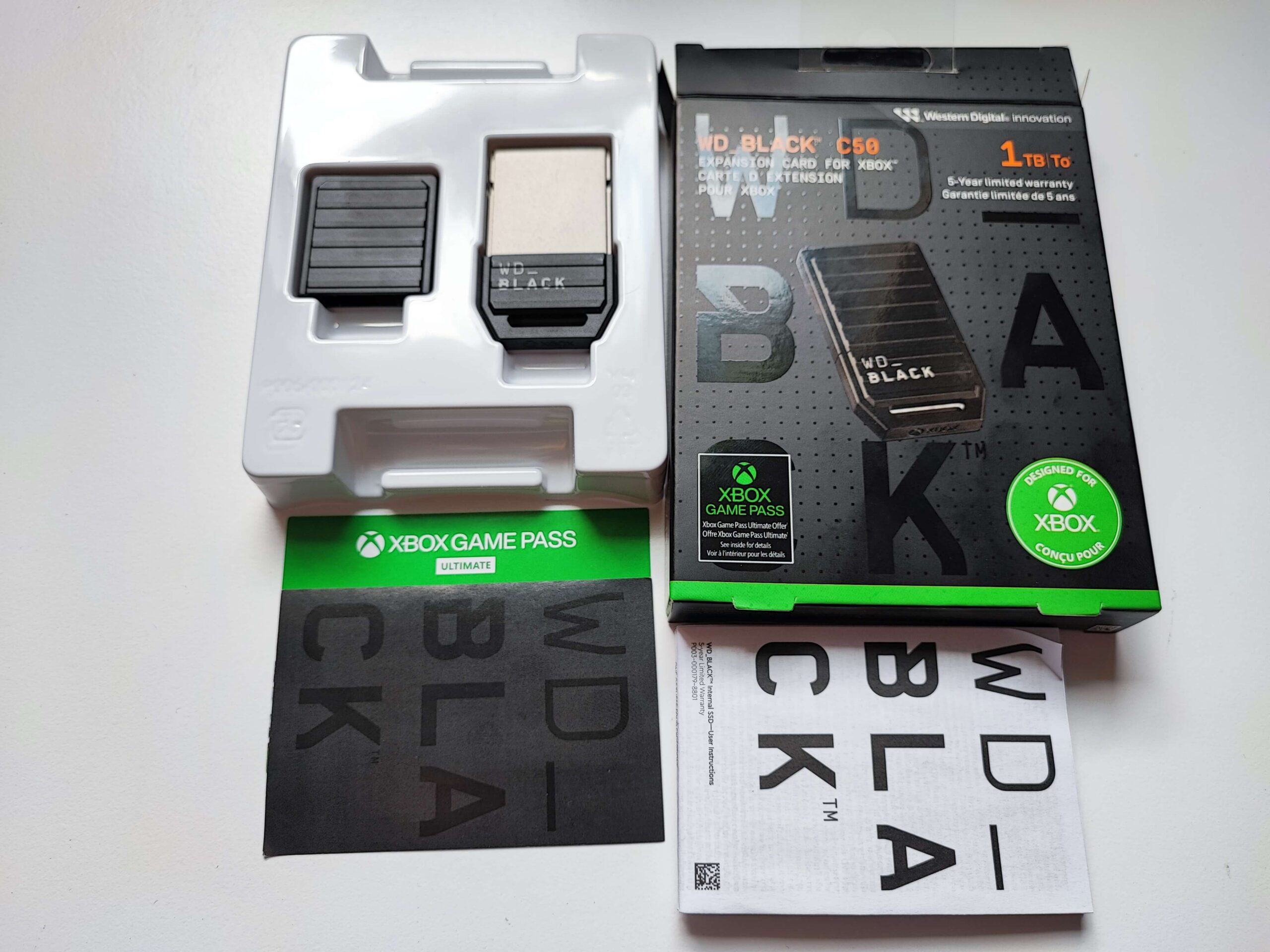 WD_BLACK C50 Expansion Card zapakowano w czarne pudełko z charakterystycznym dla produktów do konsol Xbox zielonym paskiem. Na pudełku znajdziemy znaczek „Designed for Xbox”, który oznacza, że produkt ma oficjalną licencję Xboxa oraz został sprawdzony przez inżynierów Microsoftu. Kartę objęto aż pięcioletnią gwarancją producenta, macie więc pewność, że będzie wam służyć przez niemało miesięcy. W pudełku oprócz WD_BLACK C50 Expansion Card znajdziemy także instrukcję w wielu językach oraz naklejkę z logo WD-BLACK. Co ciekawe, na papierku od naklejki z drugiej strony znajdziemy obrazkową instrukcję. Ta prezentuje montaż karty do konsoli oraz to, co należy kliknąć na ekranie TV. Miłym dodatkiem jest też jeden miesiąc abonamentu Xbox Game Pass Ultimate, choć niestety tylko dla nowych użytkowników.