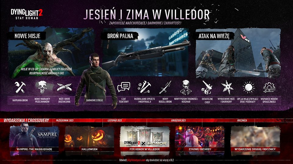 Do gry zawitają również kolejne warianty wrogów, mechanika naprawy broni i więcej darmowych strojów. Do tego dojdzie możliwość korzystania z noży i broni drzewcowej, co jest już w trakcie rozwoju. Na koniec coś naprawdę dużego. Techland wprowadzi do gry broń palną, co otworzy zupełnie nowe kierunki w sztuce eksterminacji wrogów.