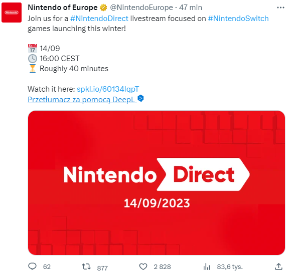 Zgodnie z zapowiedzią, Nintendo zamierza rozpocząć swój najnowszy Direct 14 września 2023 roku o godzinie 16:00 czasu polskiego. W ogłoszeniu nie podano żadnych konkretnych gier, które zostaną pokazane. Wspomniano jednak, że zobaczymy około 40 minut materiałów filmowych dotyczących nadchodzących tytułów. Szczególnie tych, które Nintendo spodziewa się wydać zimą 2023 roku. Może to obejmować jeszcze więcej szczegółów na temat Super Mario Bros. Wonder, który niedawno miał specjalną prezentację.