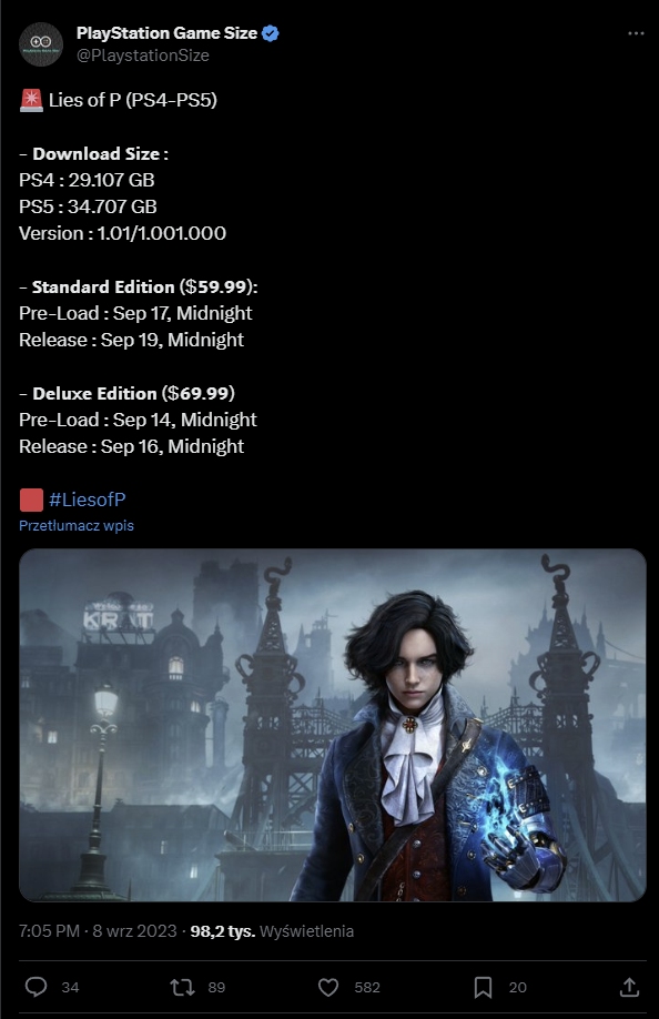 Lies of P za kilka dni pozwoli nam poznać alternatywną wersję opowieści o Pinokiu. Często pisałem newsy o tej grze, a znajdziecie je zebrane pod tym adresem. Dziś mam dla Was jednak kolejną informację. Dzięki koncie PlayStation Game Size możemy dowiedzieć się, ile miejsca na dyskach naszych konsol zajmie ten tytuł. Co więcej, poniższy wpis wskazuje też na moment, kiedy ruszy wstępne pobieranie gry. Zobaczcie sami: