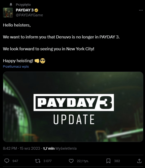 Dla pecetowców mam jeszcze dobrą wiadomość. Jak bowiem poinformowano w mediach społecznościowych, PayDay 3 nie będzie jednak miał systemu DRM Denuvo. Można się więc spodziewać lepszej optymalizacji. Należy mieć świadomość, że nadal będzie wymagane utrzymywanie połączenia z siecią – nawet chcąc grać samemu.