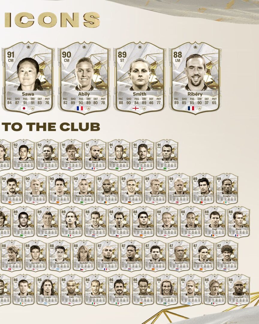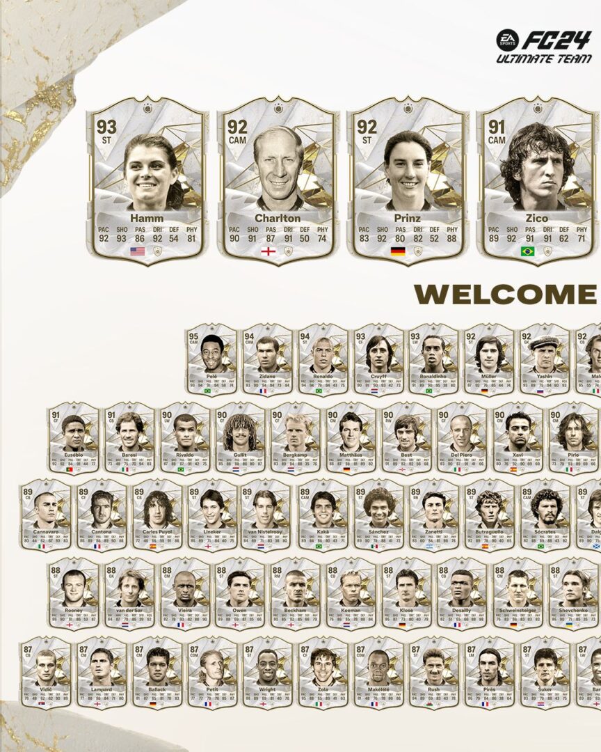 EA SPORTS FC 24 prezentuje nowe IKONY, czyli legendarnych zawodników, których będziemy mogli zobaczyć na wirtualnych boiskach w trybie Ultimate Team. Jest to też pierwsze ogłoszenie kart IKON zawodniczek. Wśród ogłoszonej ósemki znalazło się pięć piłkarek, które wyznaczyły nową jakość dla przyszłych pokoleń. Wśród znaleźli się m.in. pierwsza kobieta wprowadzona do Galerii Sław Światowego Futbolu Mia Hamm, zdobywca Pucharu Świata Bobby Charlton oraz brazylijski geniusz Zico. Więcej szczegółów w załączonej informacji prasowej.