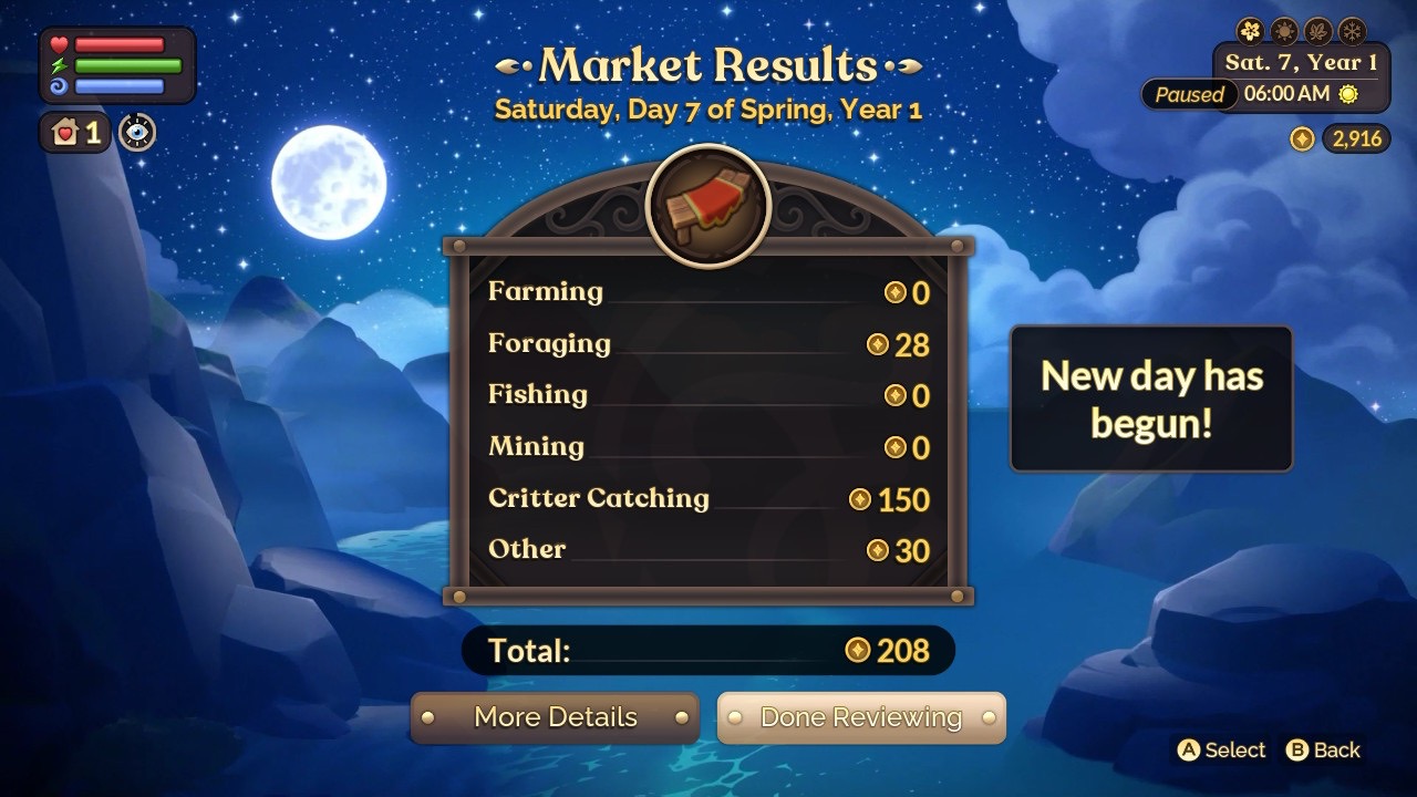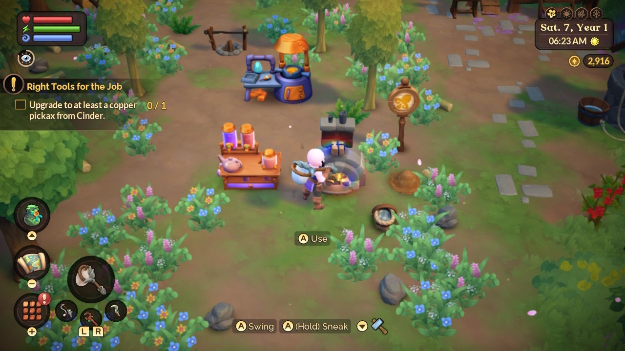 Gra dość szybko wpada w znaną z tego typu produkcji rutynę. Odblokowujemy nowe narzędzie i umiejętność, która pozwoli nam zebrać nowe materiały. Z nowych materiałów zbudujemy kolejne ulepszenia czy elementy do naszej farmy. Zasadzimy nowe rośliny, czy zaczniemy hodować nowe zwierzęta. Tylko po to, by napotkać kolejną przeszkodę, której obejście, zgadliście, wymaga zdobycia nowych narzędzi.