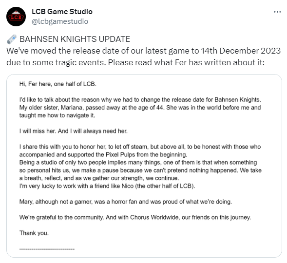 Trzecia gra w serii Pixel Pulps, Bahnsen Knights, miała mieć swoją premierę 26 października, jednak twórcy proszą o cierpliwość. Fer, połowa zespołu LCB Game Studio, podzielił się z fanami smutną informacją – jego starsza siostra właśnie zmarła. Potrzebuje więc on teraz czasu dla siebie i rodziny, co jest w pełni zrozumiałe.