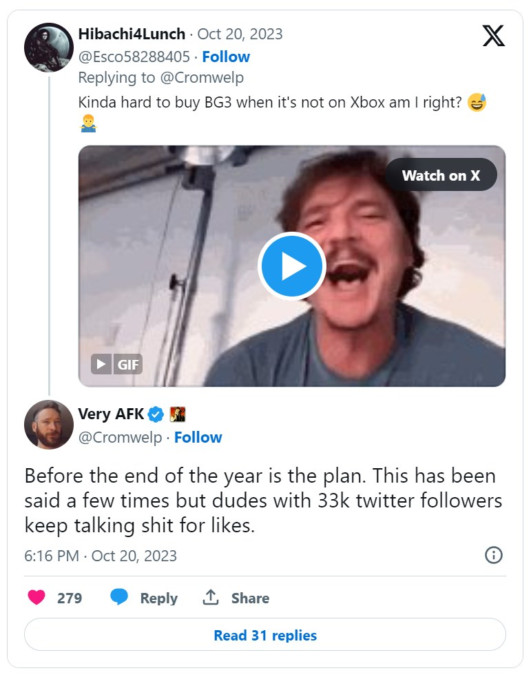 Według tego, co napisał na Twitterze/X Michael Douse, dyrektor wydawniczy Larian Studios wydanie Baldur’s Gate 3 w 2023 roku na XSX|S nadal jest w planach. Pozostaje trzymać za słowo i mieć nadzieję, że jeszcze w listopadzie zagramy na konsolach Xbox w najlepszą grę RPG tego roku.