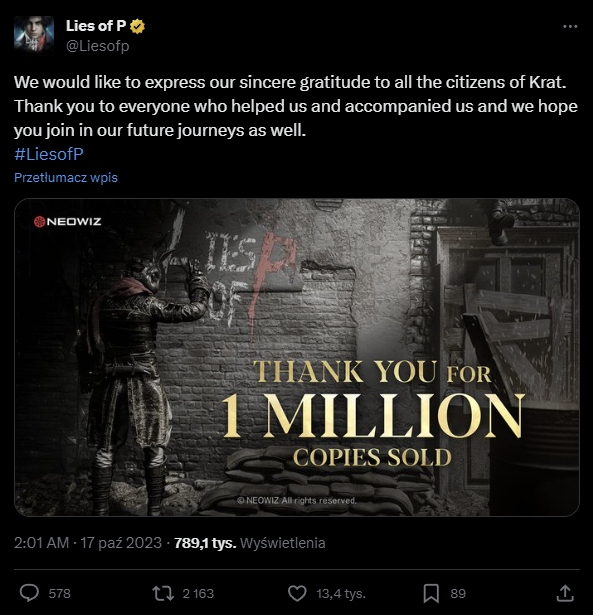 Niecały miesiąc wystarczył Lies of P na osiągnięcie niemałego sukcesu. Jak bowiem poinformowano za pośrednictwem mediów społecznościowych gry, po ten tytuł sięgnęło aż milion osób. Jak widać, soulslike wyraźnie jest popularnym gatunkiem. Oczywiście niemałe znaczenie ma fakt, że to bardzo dobra produkcja. Pisałem o tym zresztą w mojej recenzji, a możecie do niej przejść z tego odnośnika. Natomiast niżej znajdziecie komunikat, o którym wcześniej wspomniałem.