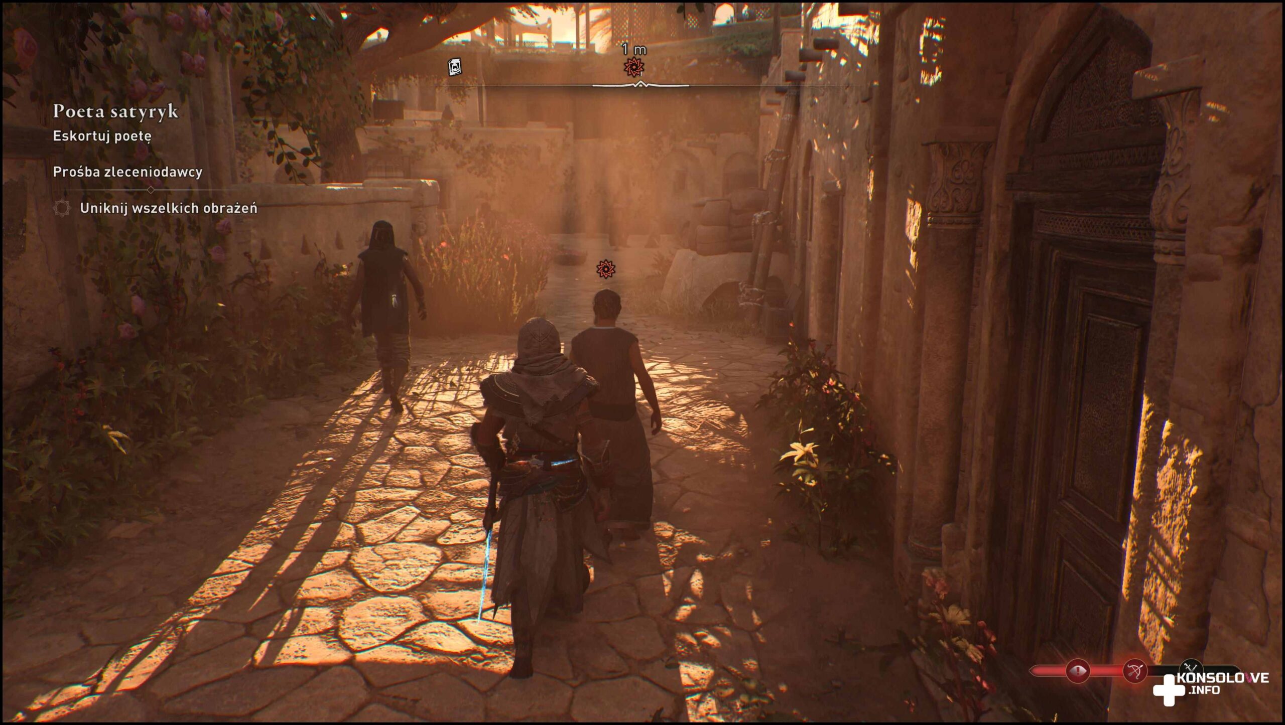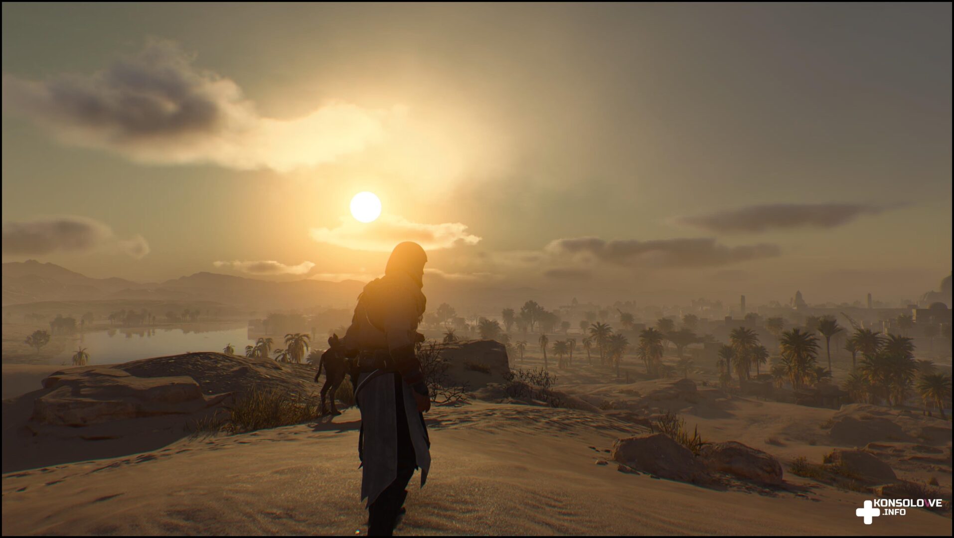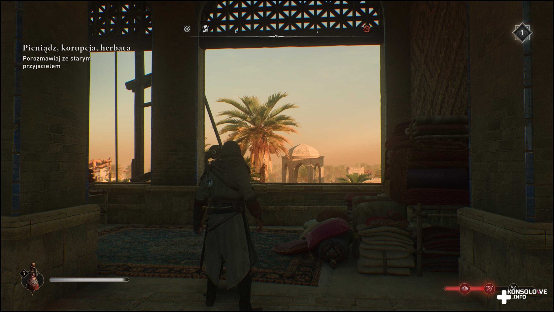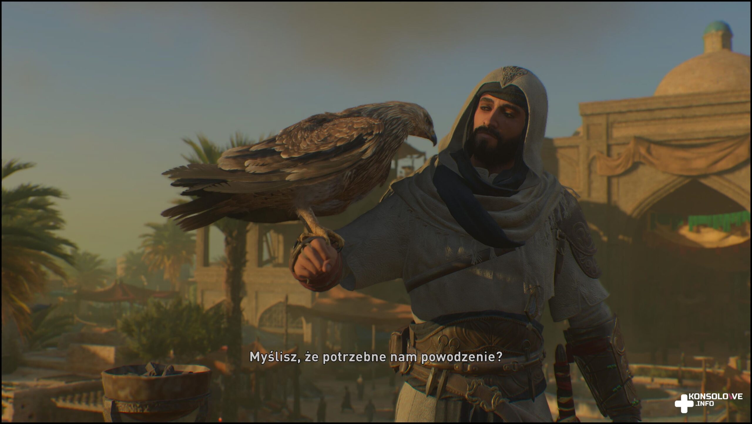 Każda odsłona Assassin’s Creed nierzadko zachwycała widokiem i nie inaczej jest w przypadku Mirage. Studio Ubisoft wyraźnie zdaje sobie z tego sprawę i dorzuca Tryb Fotograficzny. Dzięki temu możemy uchwycić naprawdę sporo imponujących rzutów ekranów. Pobawimy się tu ustawieniami ostrości, ekspozycji, winiety, czy nałożymy specjalne filtry. Warto tu się jeszcze na chwilę zatrzymać. Możemy bowiem w menu ustawień wyświetlania wybrać alternatywny filtr. Wtedy będziemy przemierzali świat w kolorystyce znanej z pierwszego Assassin’s Creed. Przyznaję, że zawsze korzystałem z tej modyfikacji podczas moich pobytów i wynik jest zdecydowanie inny od tego, jak gra się prezentuje bez filtra. Spodobało mi się także udźwiękowienie. Przemierzając ulice Bagdadu, możemy natknąć się na muzyka. Możemy mu zapłacić – oczywiście sztonem – aby zaczął grać na gitarze i śpiewać coś po arabsku. Zresztą nawet z minaretów możemy słyszeć nawoływania wiernych do modlitwy, a przyśpiewek nie brakuje też w utworach skomponowanych specjalnie do gry. Dodajmy jeszcze do tego możliwość włączenia (świetnie brzmiącego) arabskiego dubbingu i polskich napisów, a otrzymamy niezwykle immersyjną grę.