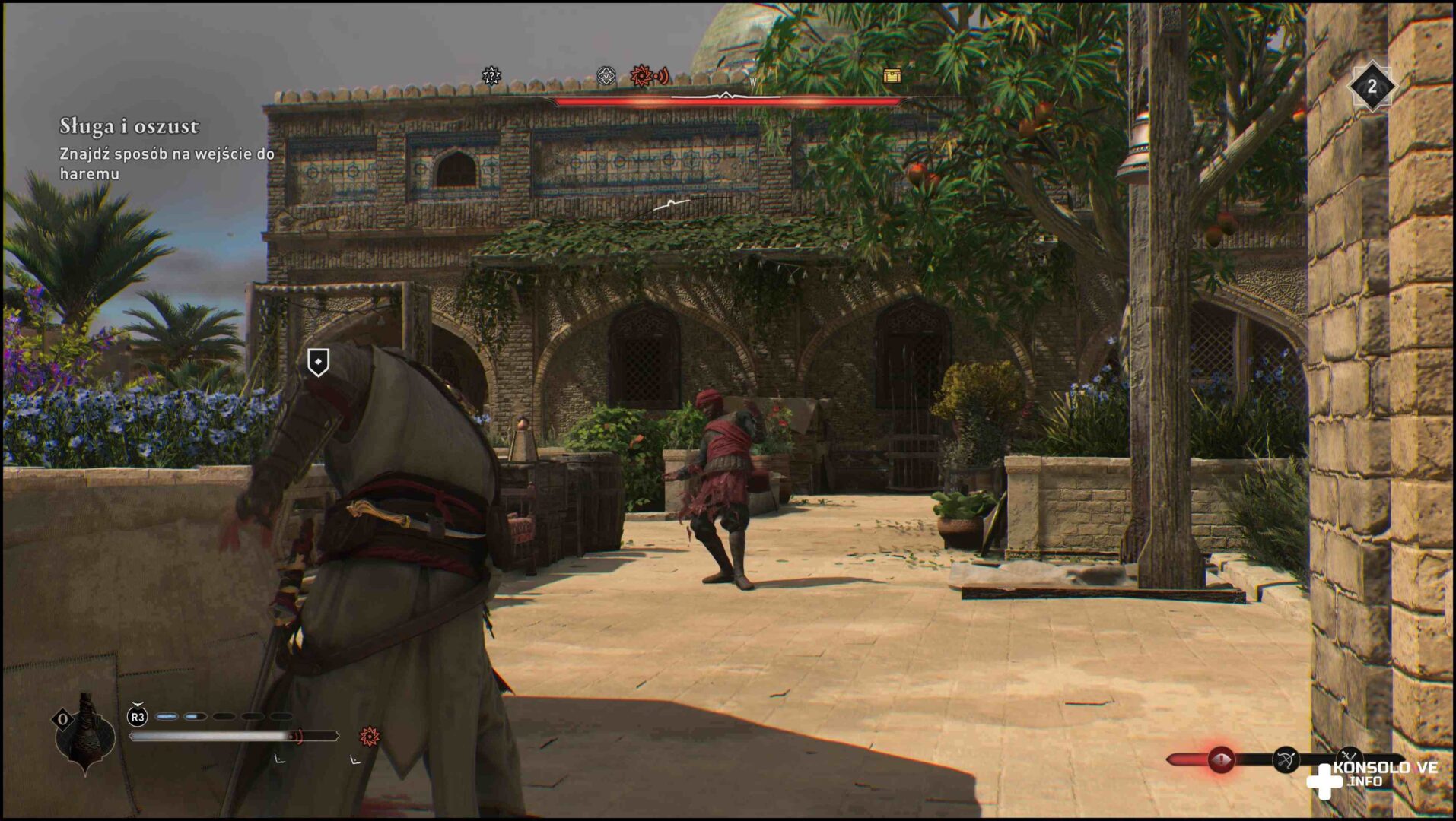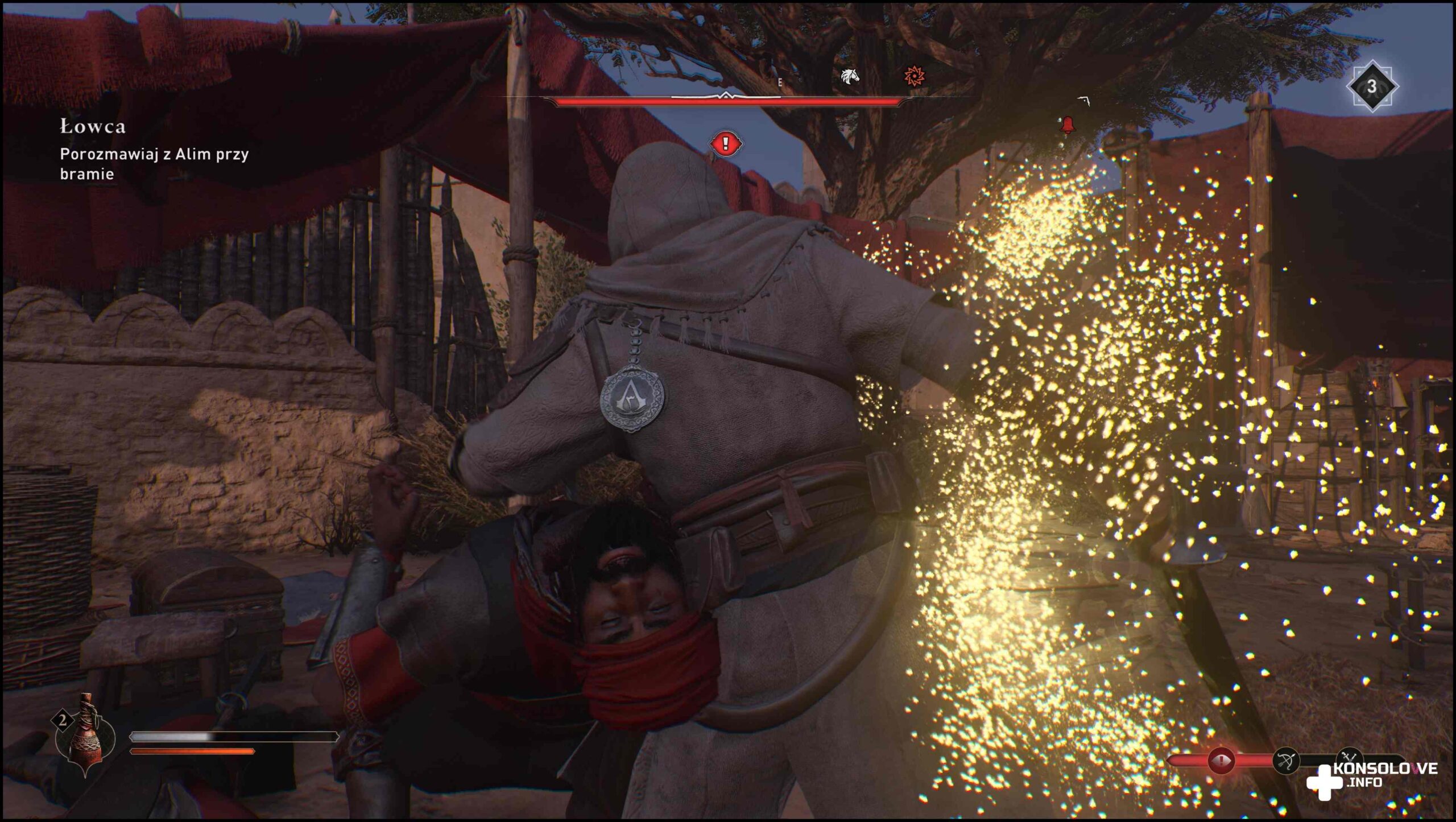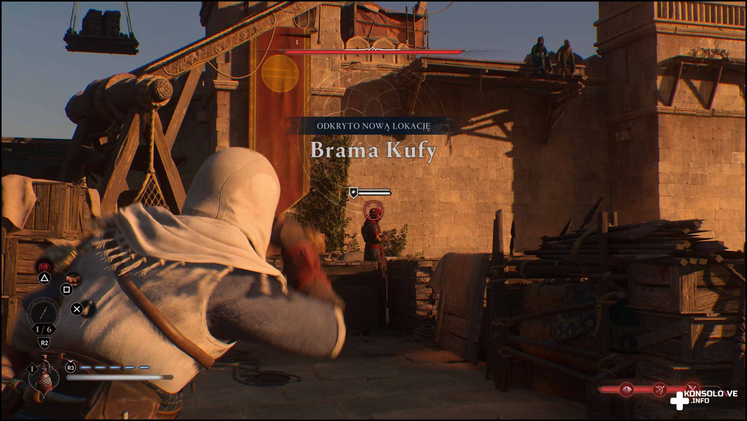 Basim nie jest oczywiście bezbronny i w konfrontacji ze strażnikami nieraz sięgnie po swoje miecz i sztylet. Z wielką ulgą stwierdziłem, że walka wręcz jest nieporównywalnie mniej chaotyczna niż w odsłonach od Origins do Valhalli włącznie. W Assassin’s Creed: Mirage mamy do czynienia z pewnego rodzaju mariażem nowych odsłon z klasycznymi. Już tłumaczę, co pod tym rozumiem. Wyprowadzane przez nas ataki mogą być szybkie oraz wolniejsze, ale silniejsze. Odpowiada za nie jeden przycisk na padzie – R1. Naciśnięcie go to szybki atak, natomiast przytrzymanie to cios zadający większe obrażenia. Mamy też unik (pod kwadratem) oraz blokowanie/kontrę – pod L1. Z grubsza, kiedy przeciwnik świeci się na czerwono, to musimy wykonać unik; tego ataku nie skontrujemy. Natomiast żółta/piaskowa barwa oznacza kontrowalny cios. Z kolei wciskając prawą gałkę analogową, zablokujemy kamerę na przeciwniku. Podoba mi się to, że walki są dość wymagające i łatwo można zginąć. Nie znaczy to bynajmniej, że Basim nie jest wytrenowanym wojownikiem. Widać jednak, że nie jest to jego preferowany sposób pozbywania się oponentów.