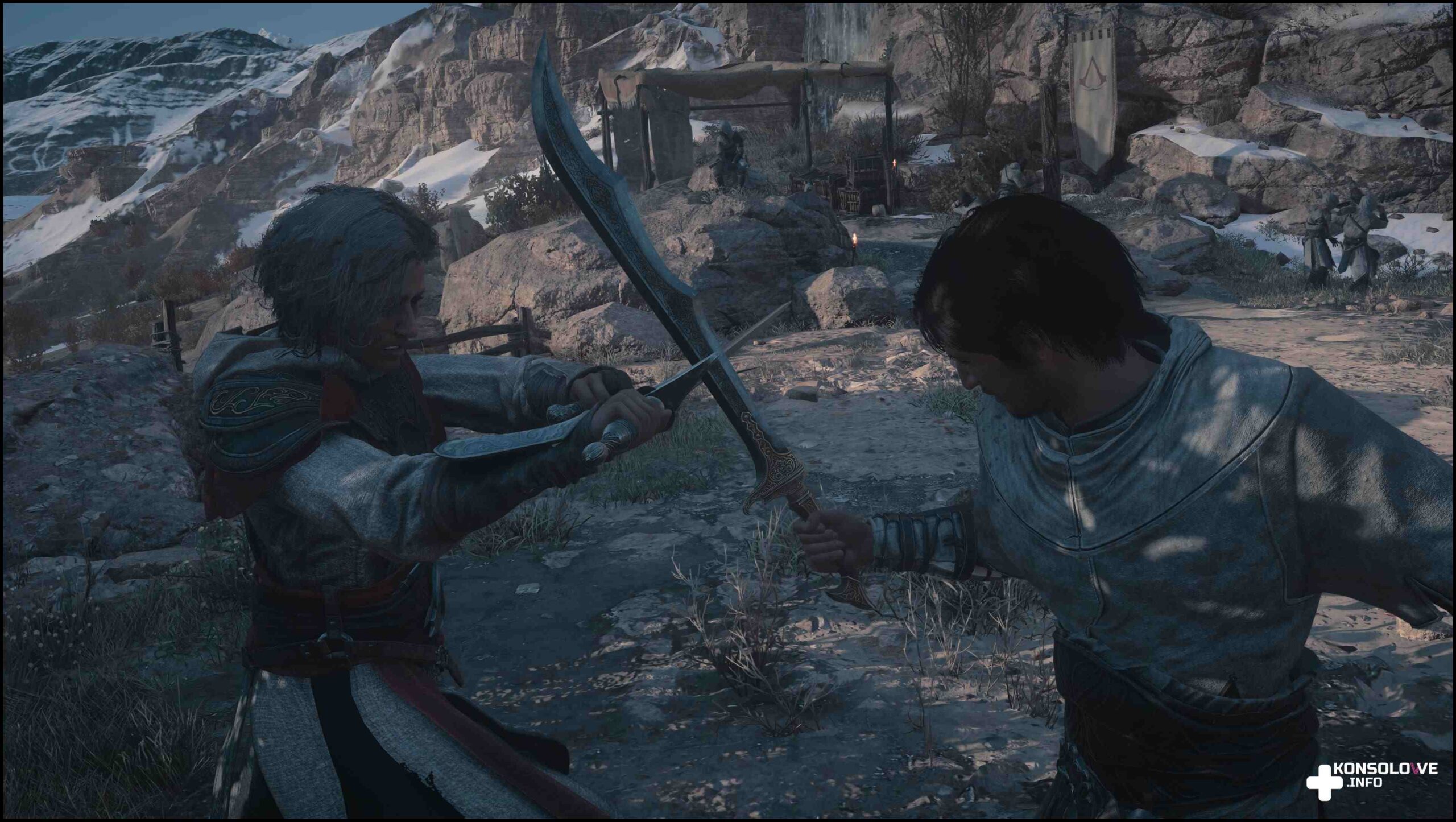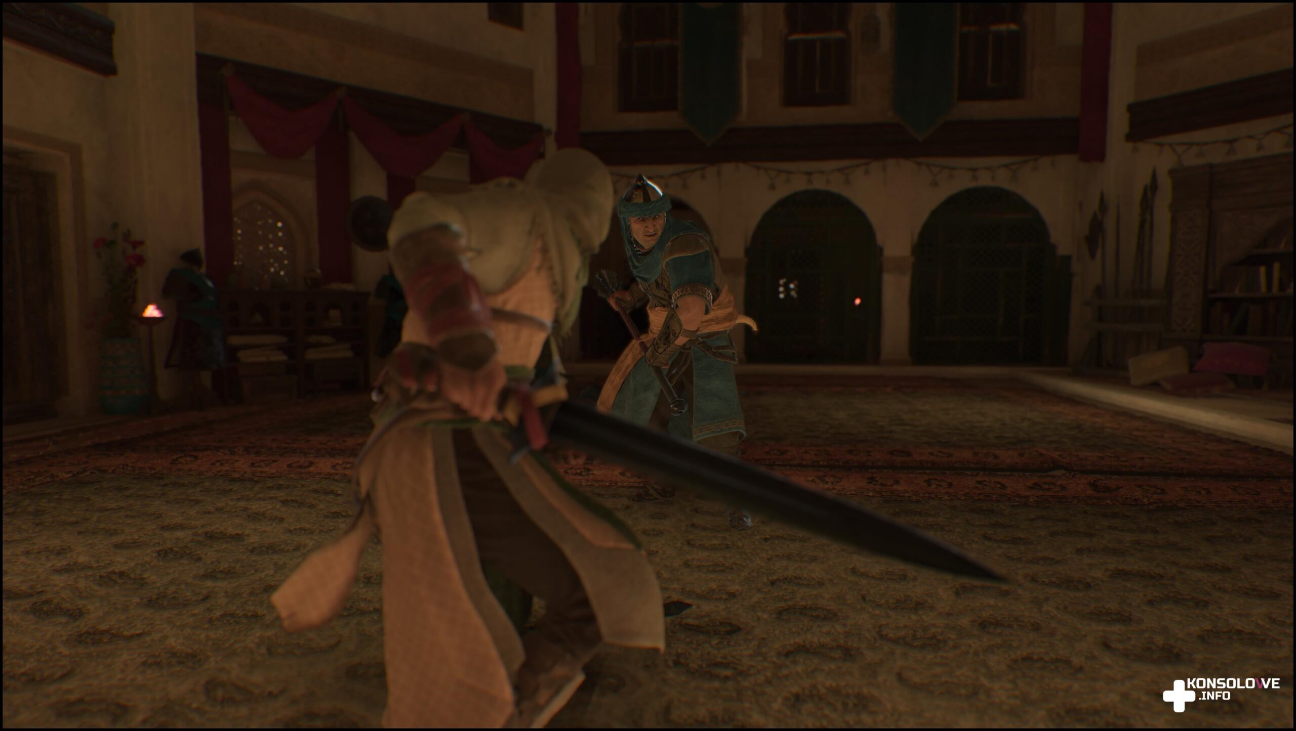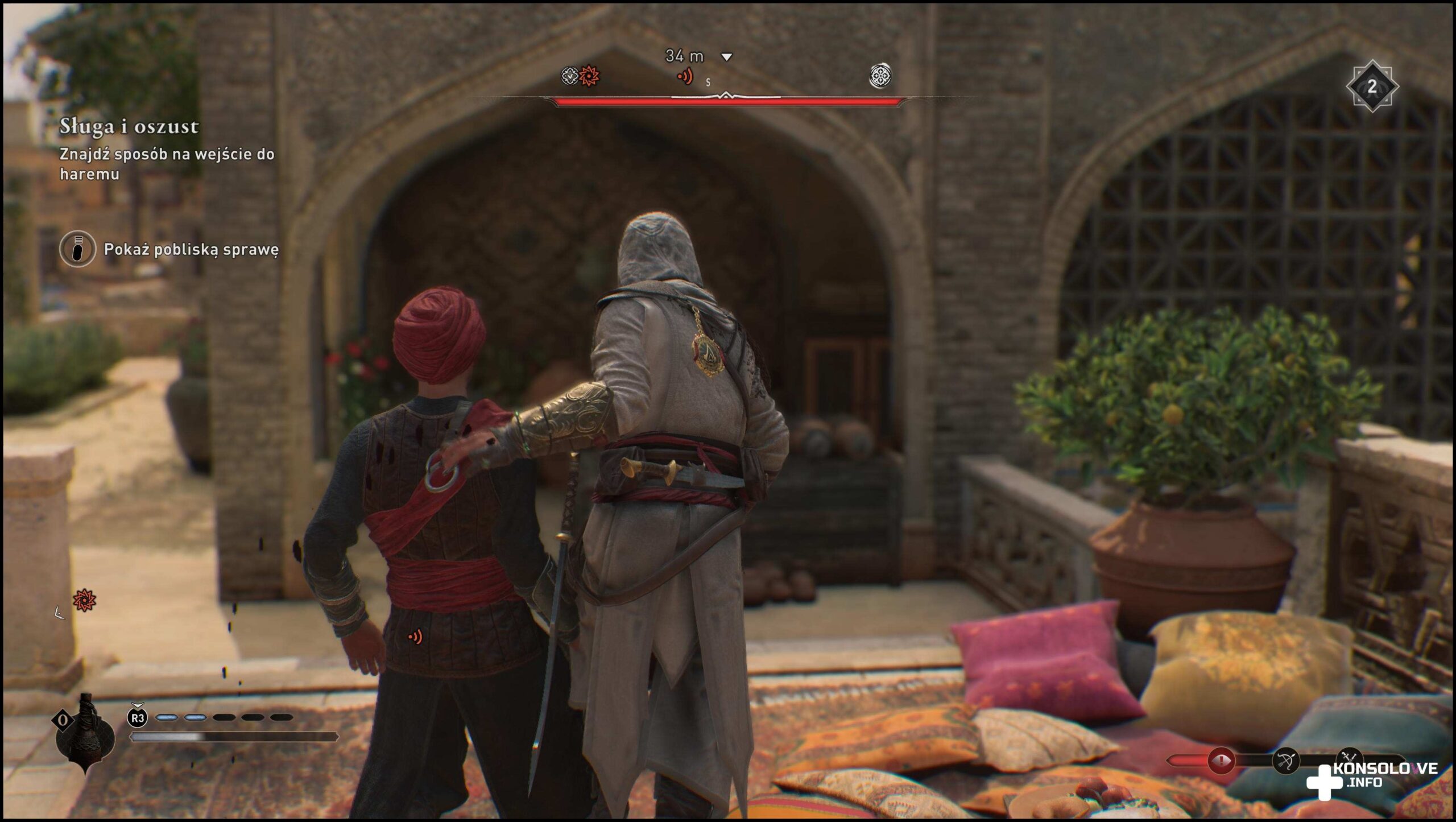 Basim nie jest oczywiście bezbronny i w konfrontacji ze strażnikami nieraz sięgnie po swoje miecz i sztylet. Z wielką ulgą stwierdziłem, że walka wręcz jest nieporównywalnie mniej chaotyczna niż w odsłonach od Origins do Valhalli włącznie. W Assassin’s Creed: Mirage mamy do czynienia z pewnego rodzaju mariażem nowych odsłon z klasycznymi. Już tłumaczę, co pod tym rozumiem. Wyprowadzane przez nas ataki mogą być szybkie oraz wolniejsze, ale silniejsze. Odpowiada za nie jeden przycisk na padzie – R1. Naciśnięcie go to szybki atak, natomiast przytrzymanie to cios zadający większe obrażenia. Mamy też unik (pod kwadratem) oraz blokowanie/kontrę – pod L1. Z grubsza, kiedy przeciwnik świeci się na czerwono, to musimy wykonać unik; tego ataku nie skontrujemy. Natomiast żółta/piaskowa barwa oznacza kontrowalny cios. Z kolei wciskając prawą gałkę analogową, zablokujemy kamerę na przeciwniku. Podoba mi się to, że walki są dość wymagające i łatwo można zginąć. Nie znaczy to bynajmniej, że Basim nie jest wytrenowanym wojownikiem. Widać jednak, że nie jest to jego preferowany sposób pozbywania się oponentów.
