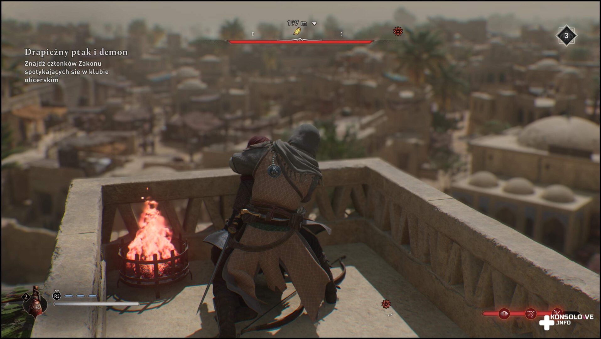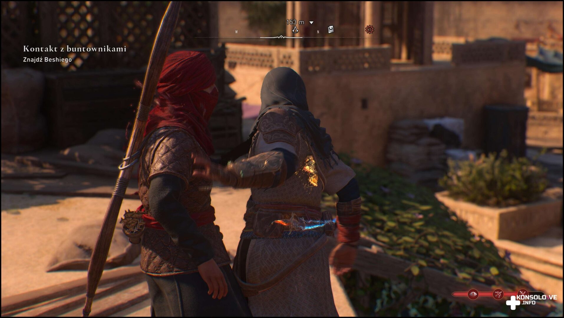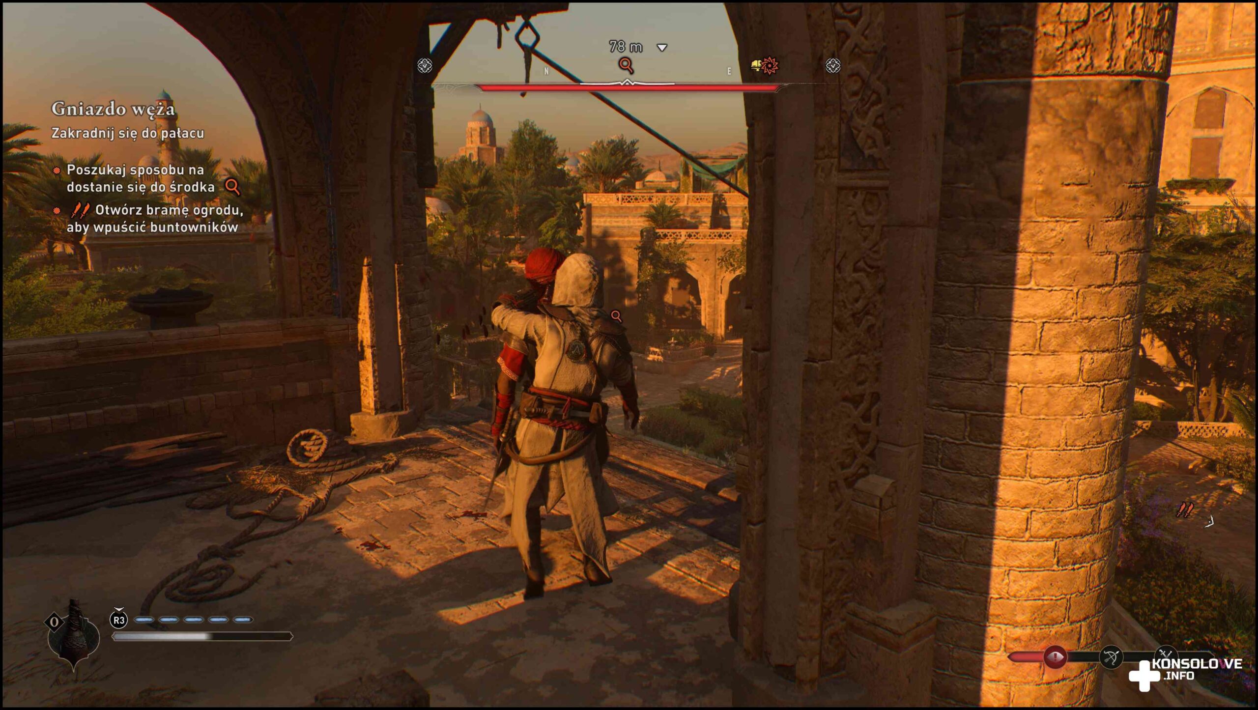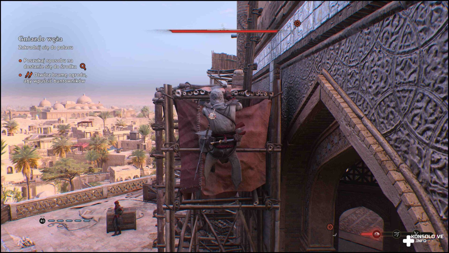 Nie od dziś wiadomo, że w zakonie Asasynów obowiązuje hierarchia. Oczywiście akcja Assassin’s Creed: Mirage przed pierwszą grą z serii (a nawet przed Assassin’s Creed: Origins), toteż nie ma tutaj asasynów w sensie stricte. Jedyna różnica na dobrą sprawę kryje się w nomenklaturze. Basim będzie się piął w górę po szczeblach rang Ukrytych. Wiąże się to nie tylko z inną nazwą jego poziomu, ale też z wyglądem stroju. Zgodnie z regułami serii, co ma też odzwierciedlenie w Mirage, większy „dziób” kaptura oznacza ważniejszą figurę w zakonie. Rangi zdobywamy za wykonywanie misji fabularnych – nie ma tu klasycznego zdobywania punktów doświadczenia. Nie dla każdego może być to zaletą, ale mi podobało się takie podejście. Kojarzyło mi się z klasycznymi odsłonami i, na szczęście, nie jest to jedyna taka analogia. Ale po kolei. Przejdźmy teraz do ulepszeń.