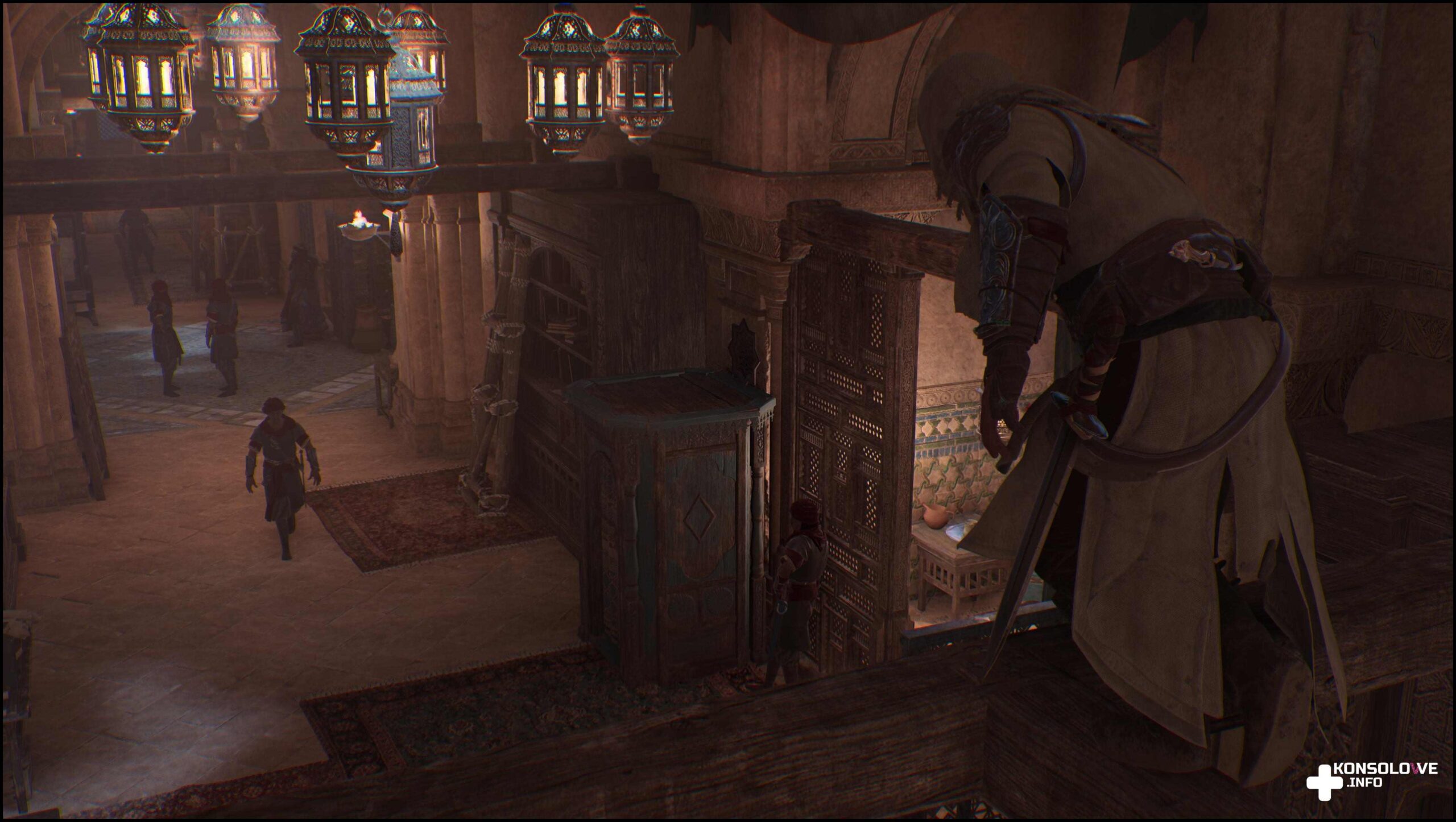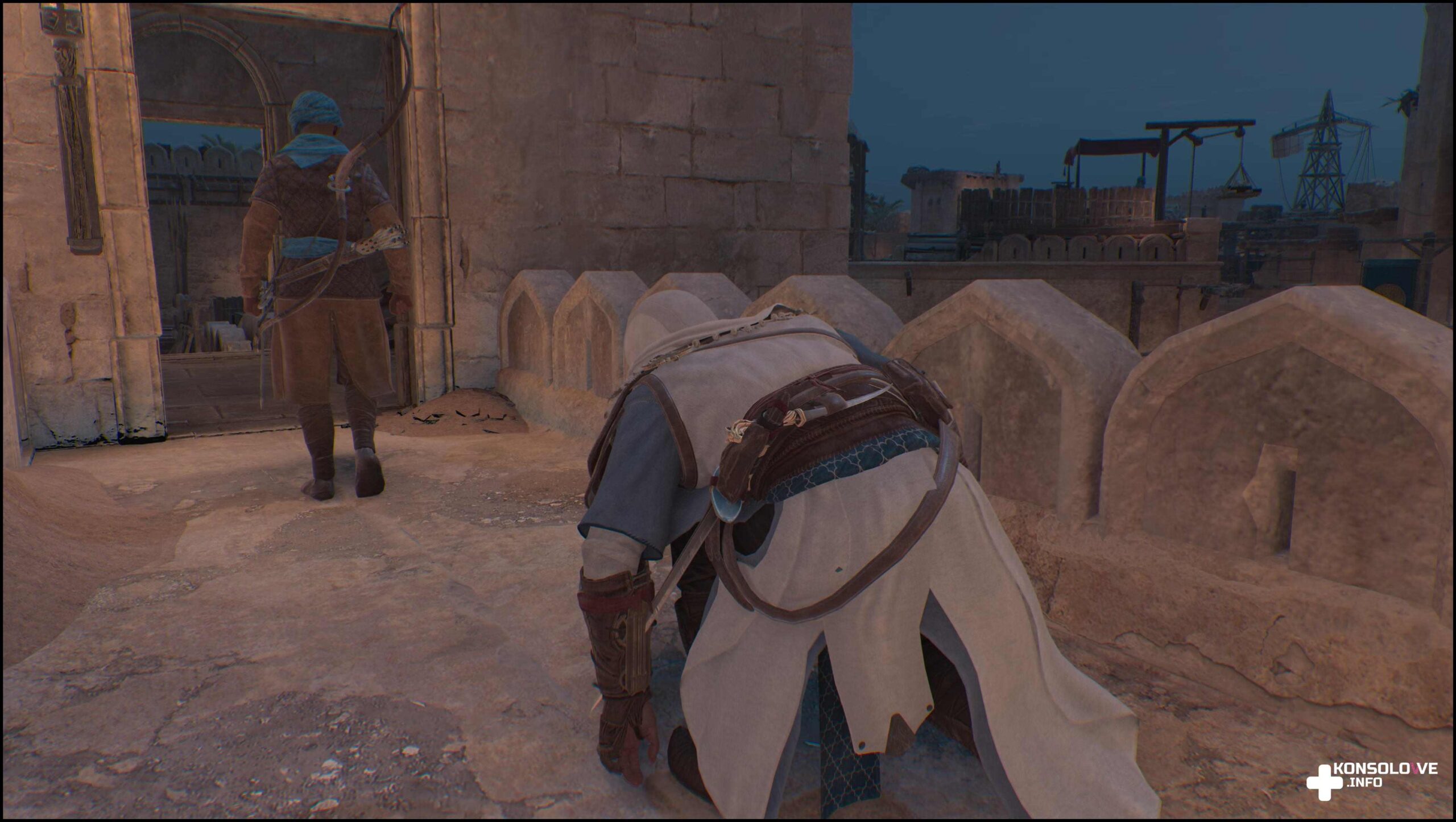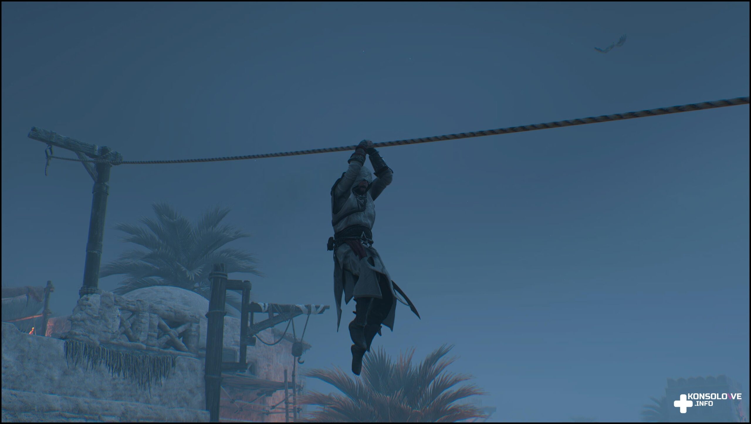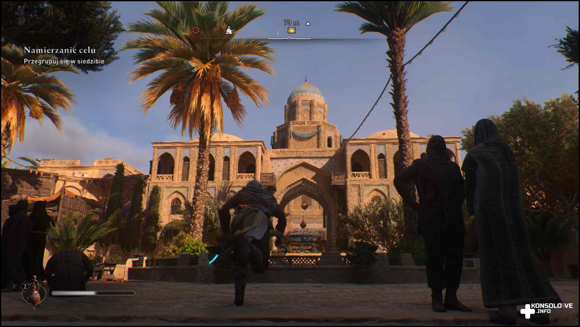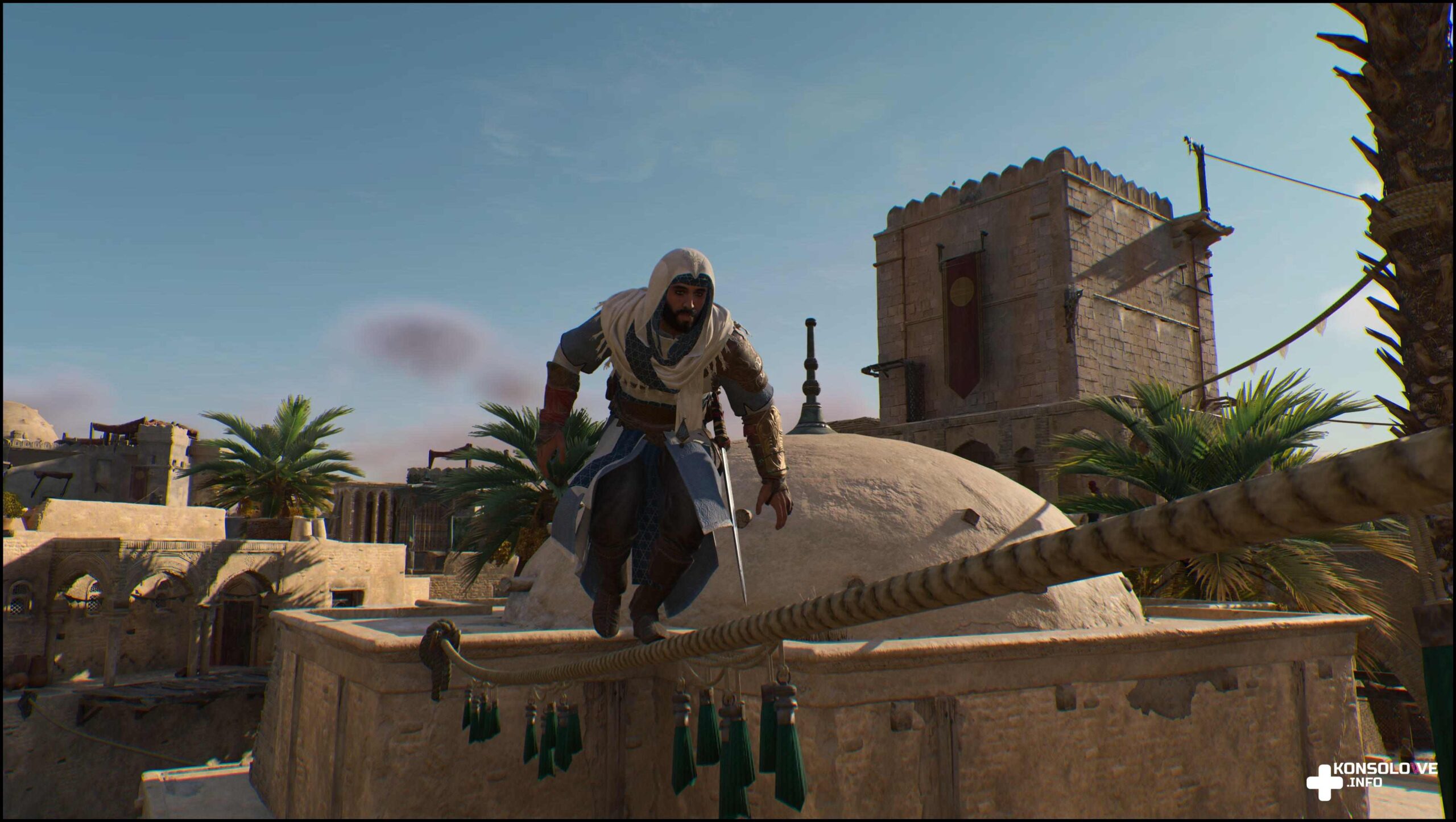 Nie może być gry z serii Assassin’s Creed bez parkouru. Basim porusza się bardzo sprawnie, a sterowanie jest, co ważne w tym przypadku, bardzo łatwe. Naciskając lewą gałkę analogową, aktywujemy sprint. Występują tu też wciągarki czy (znane z Black Flag) zawieszone na sznurach dzwony alarmowe. Możemy je naturalnie przeciąć, aby uniemożliwić przeciwnikom wezwanie posiłków. Powraca także przeskakiwanie za róg budynku, uczepiając się zawieszonej doniczki czy niszczenie straganów, aby utrudnić drogę goniącym nas przeciwnikom. Sterowanie jest na szczęście bardzo łatwe. Przytrzymując X i biegnąc przed siebie, będziemy pokonywali górą napotykane przeszkody oraz, oczywiście, wspinali się na budynki. Nierzadko znalezienie następnego miejsca, na ścianie, które Basim mógłby chwycić może się okazać nie lada wyzwaniem. Często możemy mieć bowiem wrażenie, że sięgamy ku płaskiej powierzchni. To jednak coś, co musimy akceptować, sięgając po grę z cyklu Assassin’s Creed. W parkourze podoba mi się też to, że możemy przytrzymywać kółko, a Basim będzie pokonywał przeszkody i starał się dostać niżej. O dziwo nie znajdziemy w tej grze wbiegania na ścianę, wybicia się podczas biegi i przeskoczenia w jeden z dwóch boków. Ogólnie jednak parkour wygląda bardzo przyjemnie i można grać w Mirage nawet tylko po to, aby przemierzać miejsca z przeszłości.