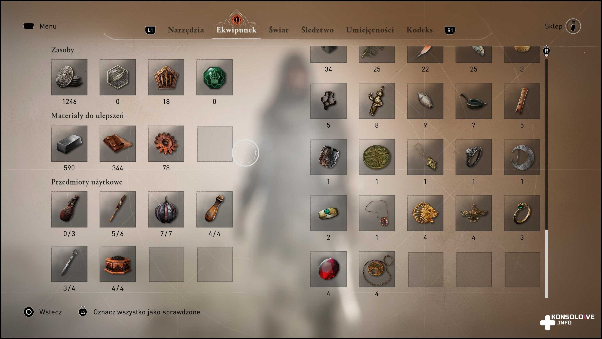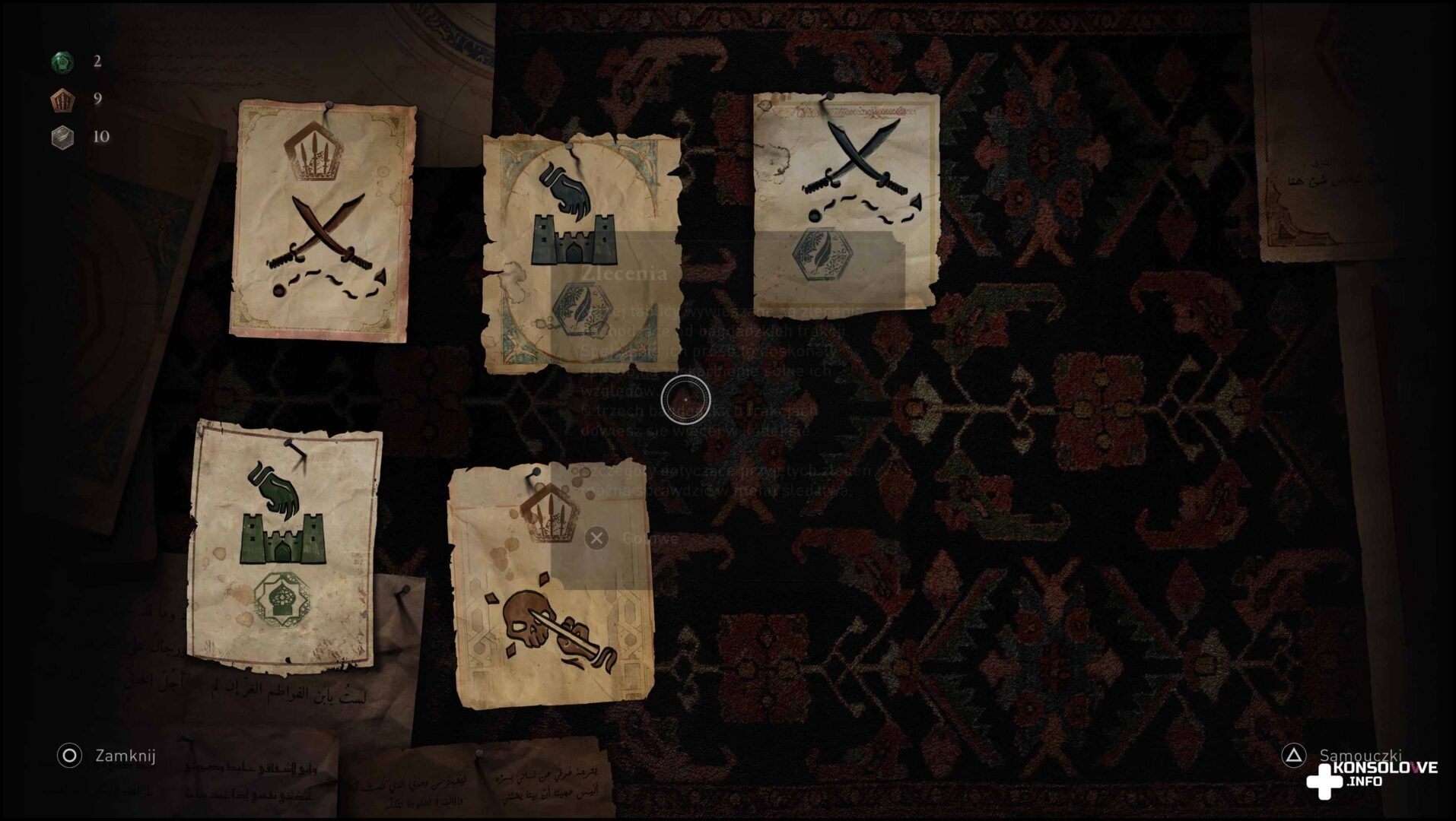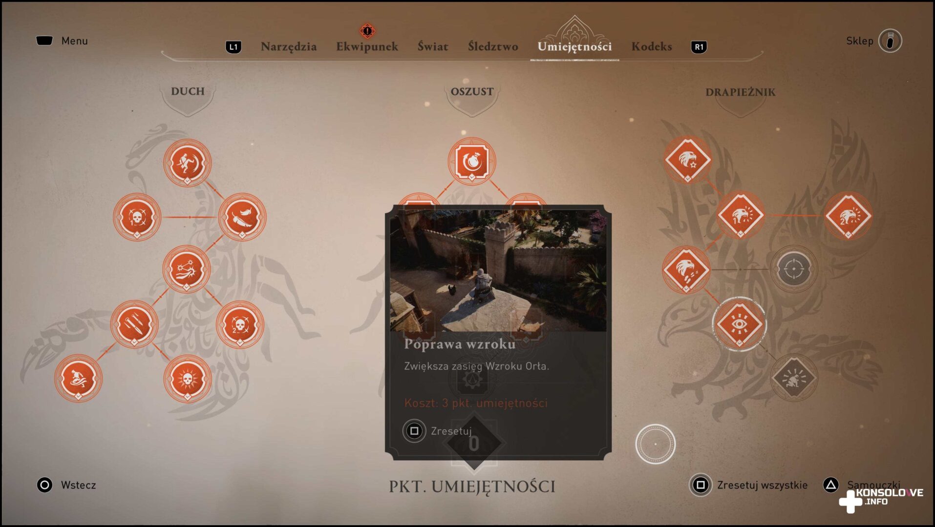 Jak we właściwie każdej odsłonie Assassin’s Creed od dwójki wzwyż, w Miage nie może zabraknąć ulepszania bohatera i wyposażenia. Rozwój Basima, jak już pisałem, jest efektem poczynionego postępu w głównej linii fabularnej. Za niektóre zadania poboczne także dostajemy punkty rozwoju, ale zdecydowaną większość zapewniają główne misje. Następnie zdobyte punkty możemy przeznaczyć na rozwój i odblokowanie umiejętności w trzech drzewkach. Niektóre wpłyną na skuteczność i zasięg wykrywania interesujących elementów przez naszego orła, Senu. Jest też zdolność, dzięki której automatycznie ograbimy ciała zabitych po cichu przeciwników. Odblokowane mogą być również dodatkowy ładunek eliksiru leczniczego czy pasek specjalnego zabójstwa ukrytym ostrzem (o czym więcej później). Umiejętności są na tyle zróżnicowane, że każdy znajdzie coś dla siebie. Ja niemal zawsze miałem coś, co chciałem odblokować.