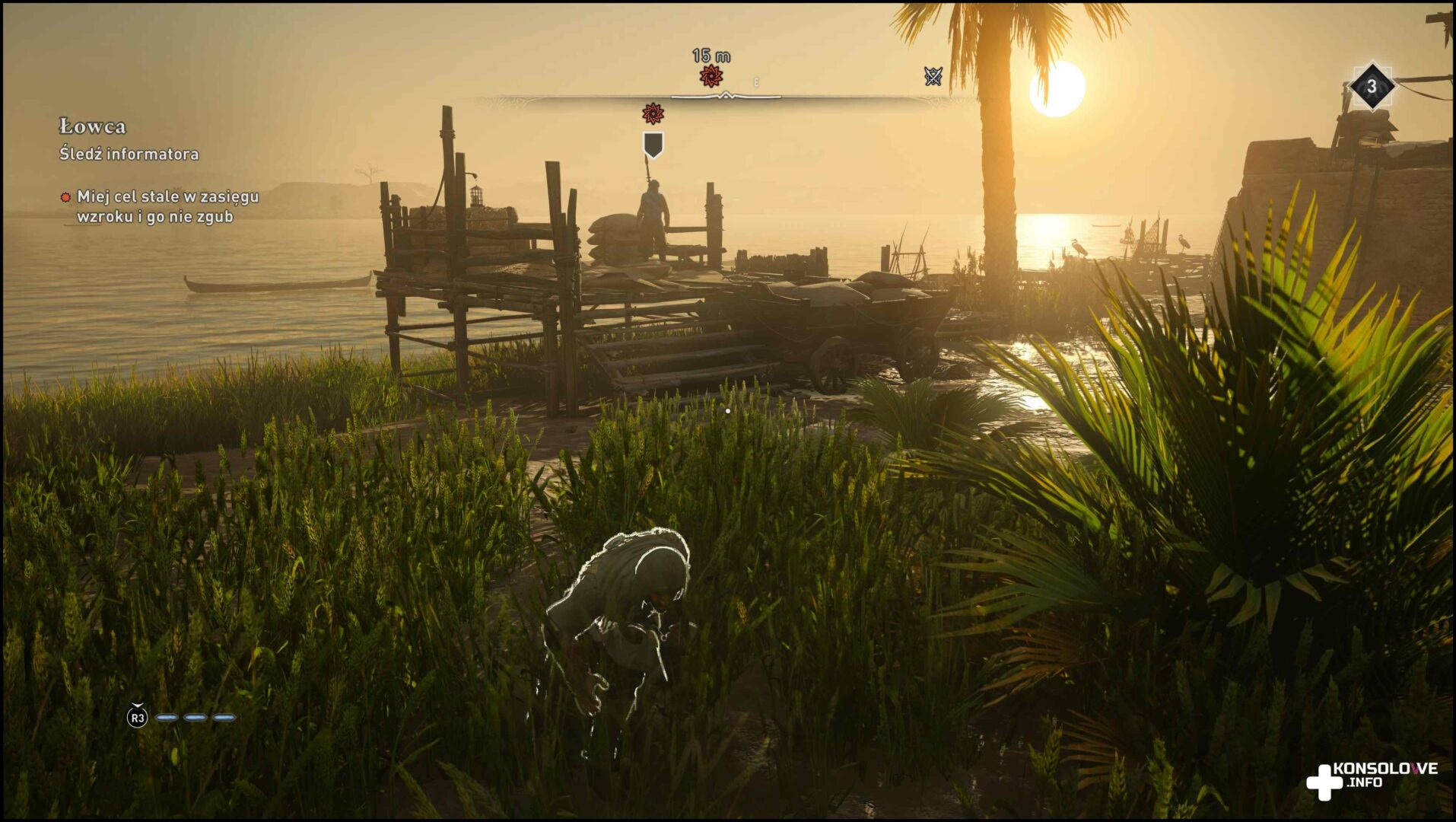 Nie da się bowiem oprzeć wrażeniu, że to właśnie przekradanie się przez zastrzeżone obszary i zdejmowanie przeciwników po cichu jest tym, w czym Basim jest mistrzem. Większość przeciwników można załatwić po cichu, wbijając im ukryte ostrze znienacka, niczym duch. Niestety nie każdego strażnika załatwimy momentalnie w ten sposób; niektórym zabierzemy tylko sporą część zdrowia. Szkoda – zawsze wolałem gwarancję zabójstwa po zbliżeniu się do nieświadomego nas przeciwnika. Skradanie ułatwiają również akcesoria, z których może korzystać Basim. Moim podstawowym rodzajem były noże do rzucania. Po wyekwipowaniu ich (przytrzymując prawy spust i wychylając prawą gałkę analogową), możemy przytrzymać lewy spust. Wycelujemy wtedy nożem w wybraną część ciała przeciwnika – należy zaznaczyć, że rzut w głowę zadaje większe obrażenia niż na przykład rzut w stopę, co jest oczywiście sensowne. Mało tego, ulepszając noże, możemy ustawić roztapianie ciał po zabiciu przeciwników rzutem w głowę. Dziwaczne, ale mocno ułatwia przekradanie się – dzięki temu nie musimy pamiętać o chowaniu ciał. Basim korzysta też z wabików, pułapek czy pochodni do rozświetlania sobie drogi. Moim drugim – po nożach – ulubieńcem jest jednak dmuchawka na strzałki. Dzięki niej poślemy oponent w objęcia Morfeusza. Pamiętajcie jednak, aby koniecznie schować ciało – nie chcemy chyba, żeby inny strażnik obudził tego wroga, co może się zdarzyć.