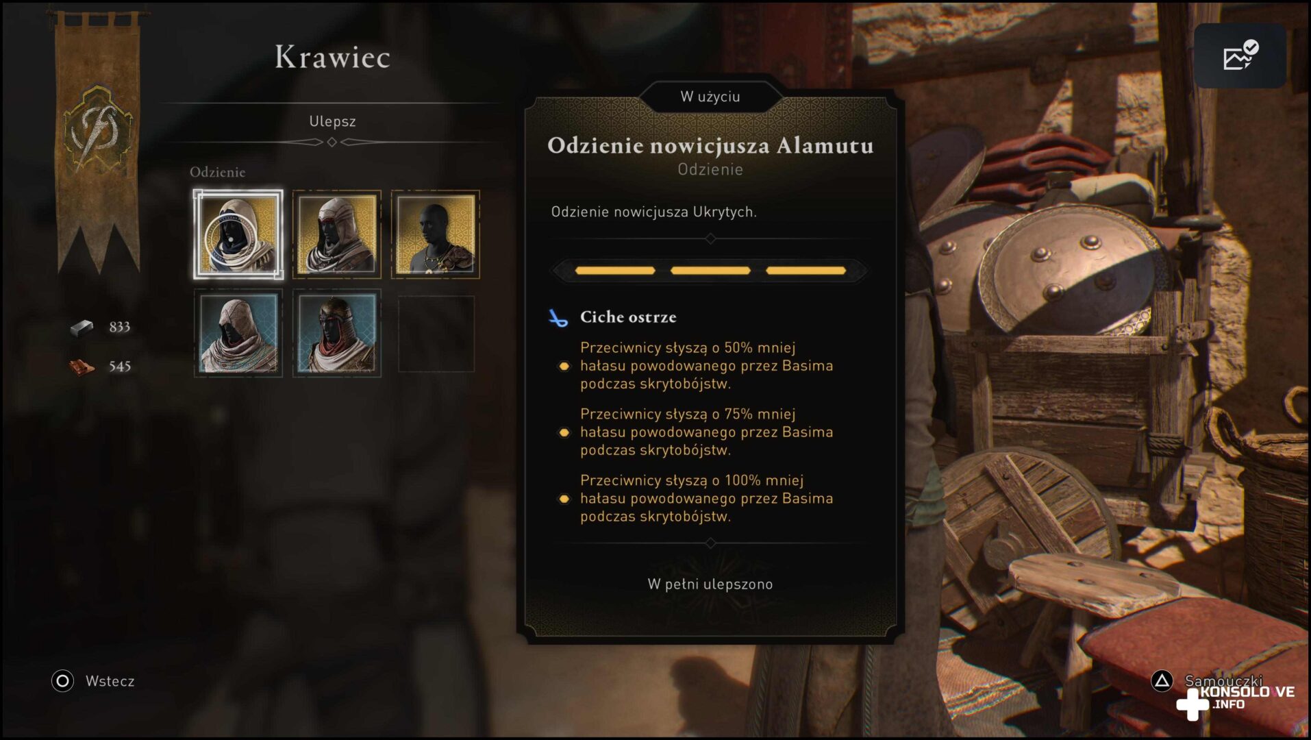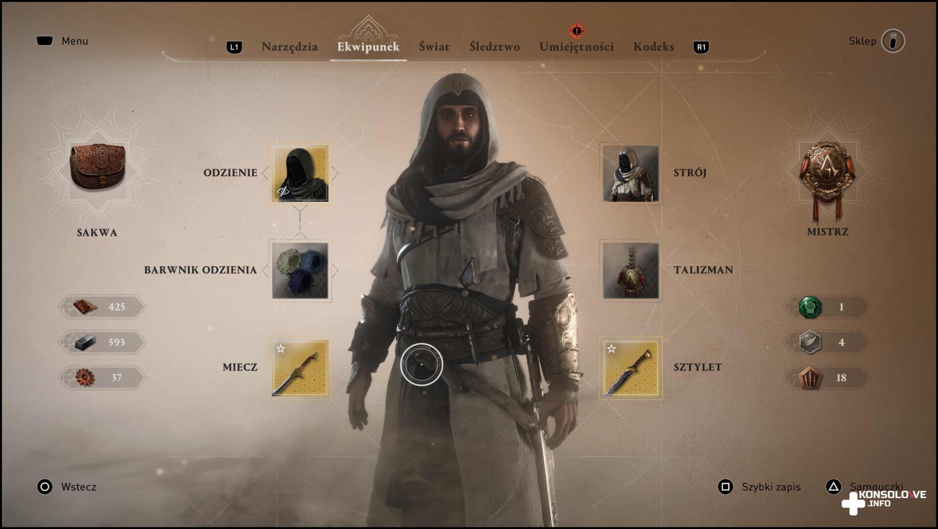 W Assassin’s Creed: Mirage można też rozwijać wyposażenie, choć nie jest to niestety poziom tego, co mieliśmy już w „dwójce”. Bardzo lubiłem kupować tam coraz lepsze elementy pancerza, jak karwasze, czy nagolenniki. Różniły się one nie tylko poziomem zapewnianej obrony, ale i oczywiście wyglądem. W Mirage zarządzenie wyposażeniem jest nieporównywalnie prostsze. Wystarczy bowiem mieć odpowiednią ilość niezbędnych komponentów – trzech rodzajów – i udać się do krawca lub kowala, aby ulepszyć dany strój lub oręż. Ze strojem wiążą się też dodatkowe profity – jeden ubiór może zapewniać na przykład mniejszą wykrywalność przez przeciwników podczas skradania się. Inny może zamiast tego oferować zadawanie większych obrażeń, gdy Basim ma poniżej określonego poziomu zdrowia. Bardzo dobre jest też to, że Ubisoft zawarł w swojej grze system tak zwanej transmogryfikacji. Dzięki temu nie ma problemu z zachowaniem statystyk i działania jednego stroju czy oręża przy wyglądzie innego.