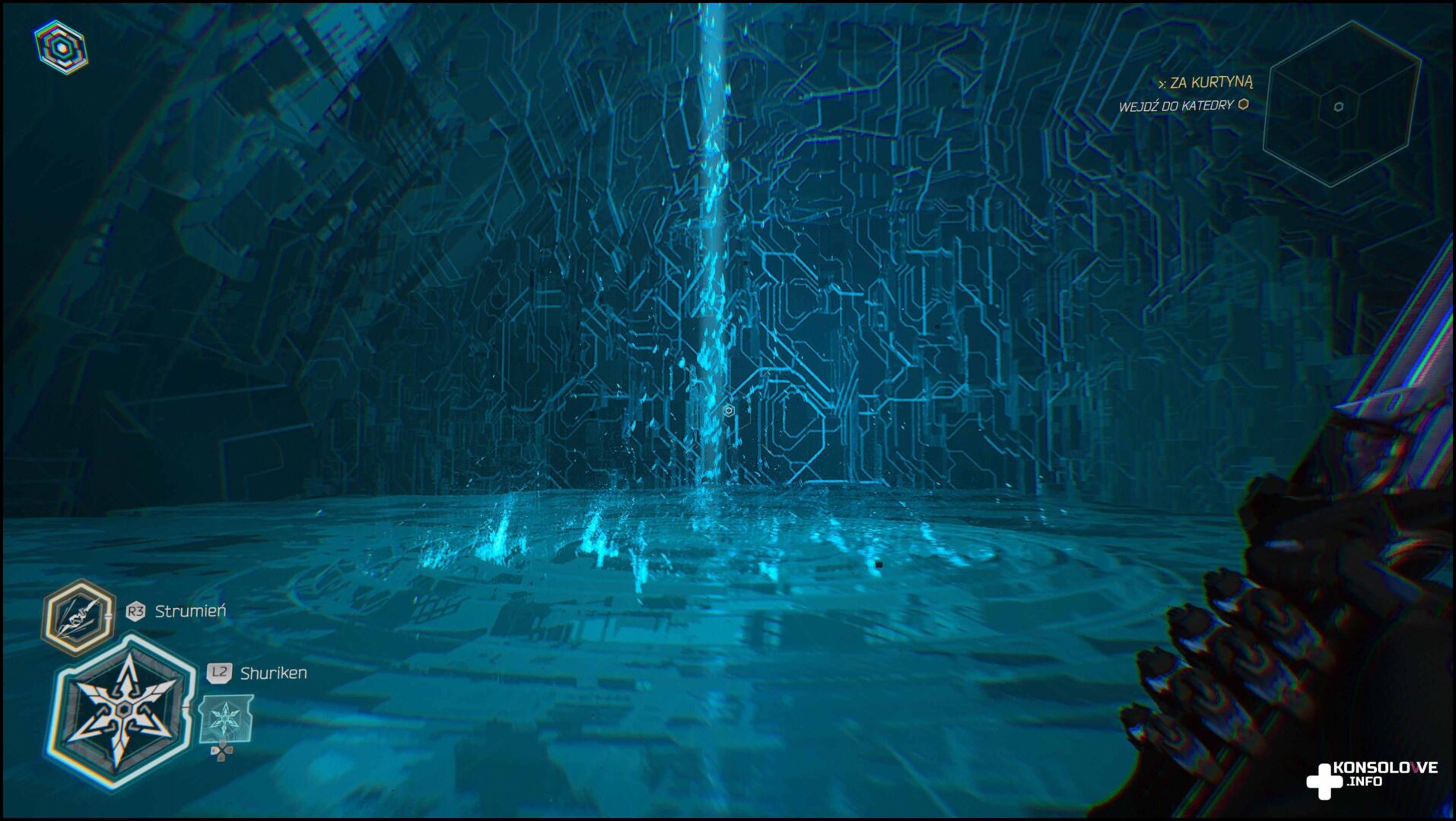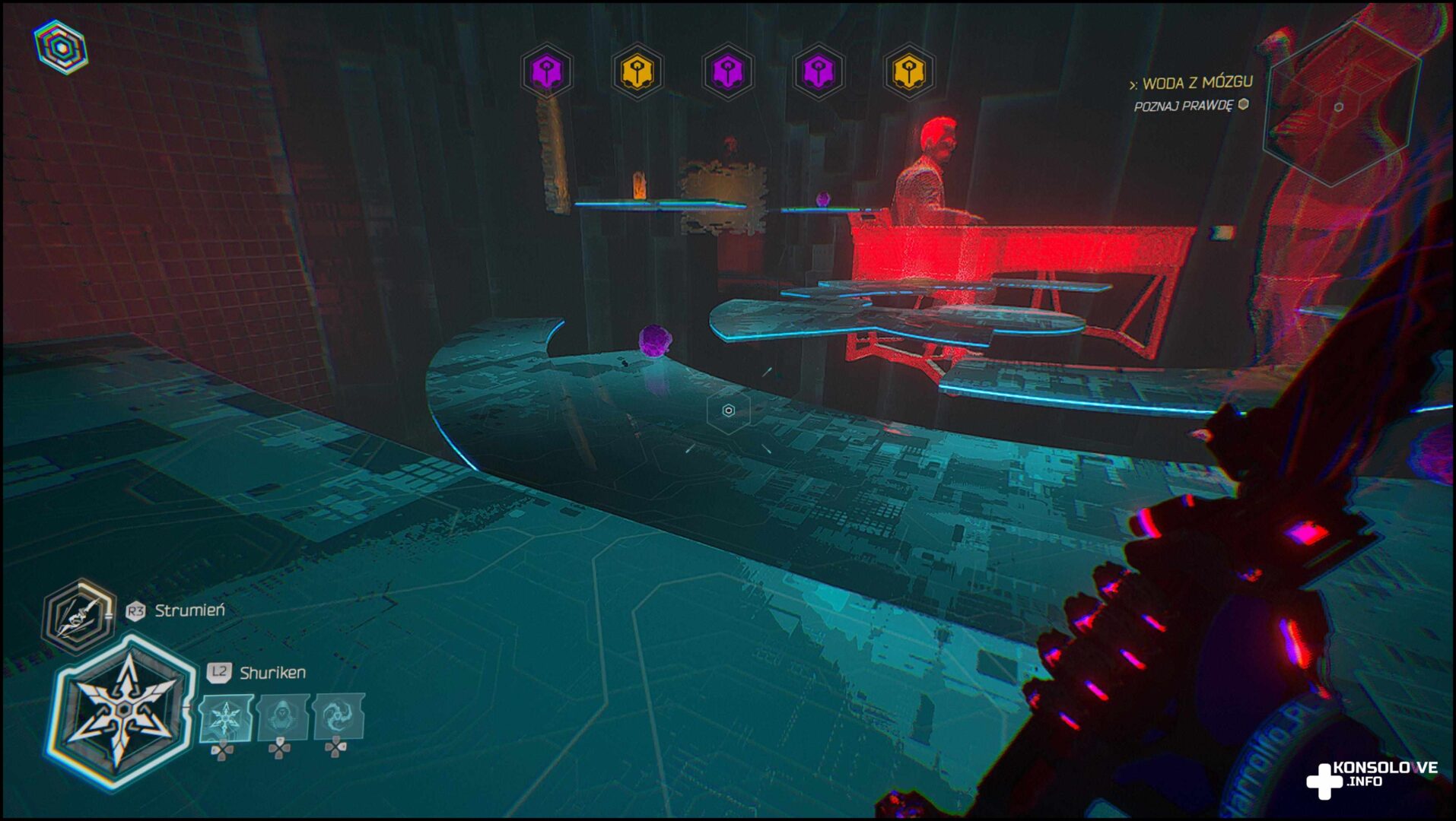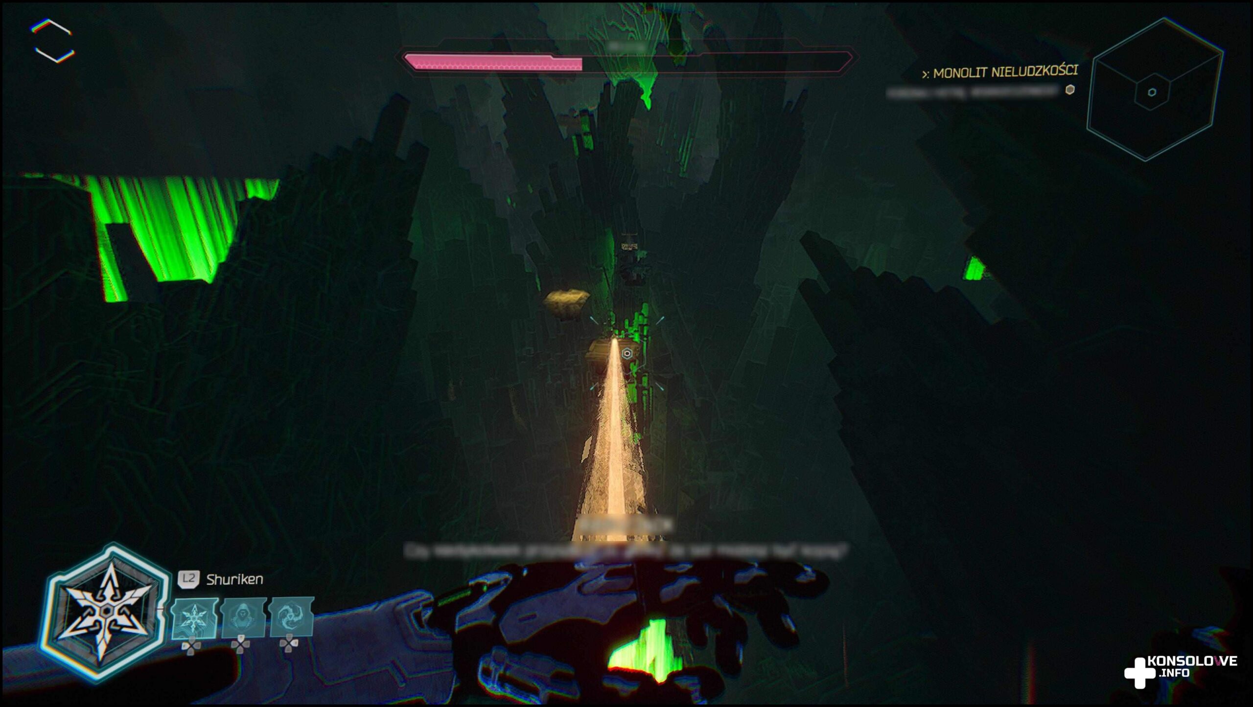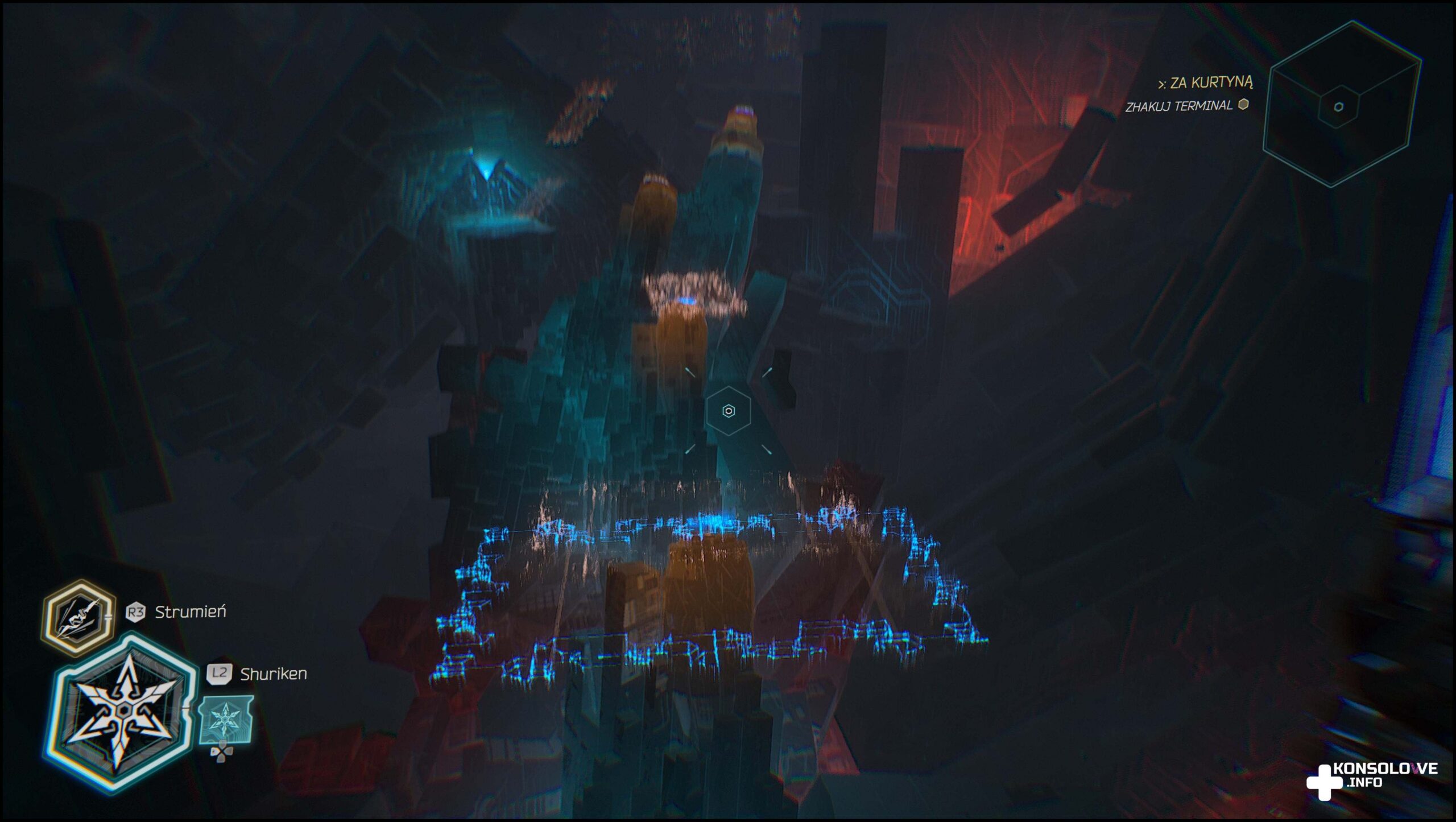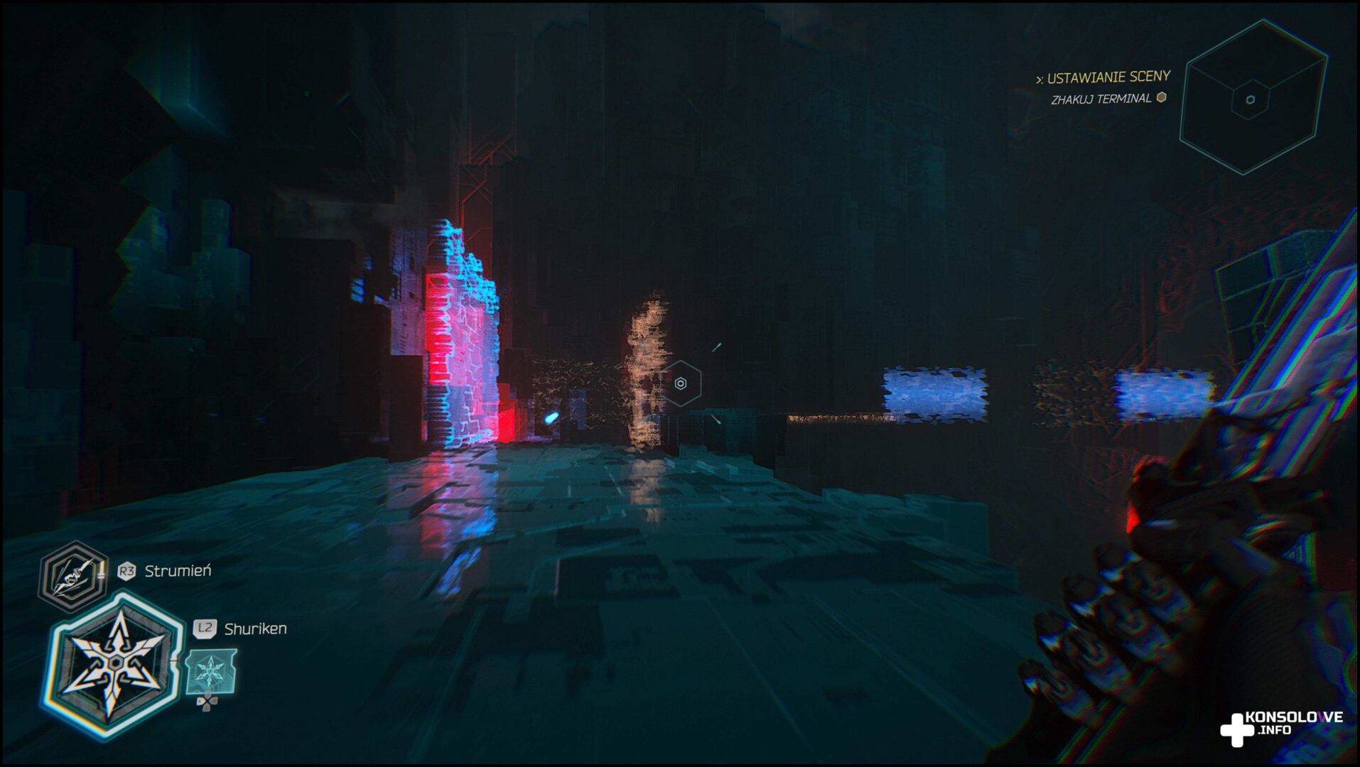 Jako że Ghostrunner 2 jest produkcją, której akcja dzieje się w świecie przyszłości, to nie może zabraknąć pewnego cyberpunkowego elementu. Mam na myśli oczywiście hakowanie. W tej polskiej grze zastosowano zgoła inne podejście niż w dziele CD Projekt RED, Cyberpunku 2077. Fakt faktem, że V przebywał czasem w cyfrowej warstwie. Jednak zdecydowana większość hakowania odbywała się za pomocą odpowiedniego interfejsu i mini-gry. Natomiast One More Level postanowiło podczas każdego hakowania przenieść Jacka do wirtualnej powłoki. W niej naszym zadaniem będzie dotarcie do strumienia danych i (poza kilkoma drobnymi wyjątkami) nie skupimy się na walce. Zamiast tego należy skoncentrować się na wykonywaniu sekwencji platformówkowych i poszukiwaniu dalszej drogi w locie (nierzadko nawet dosłownie).