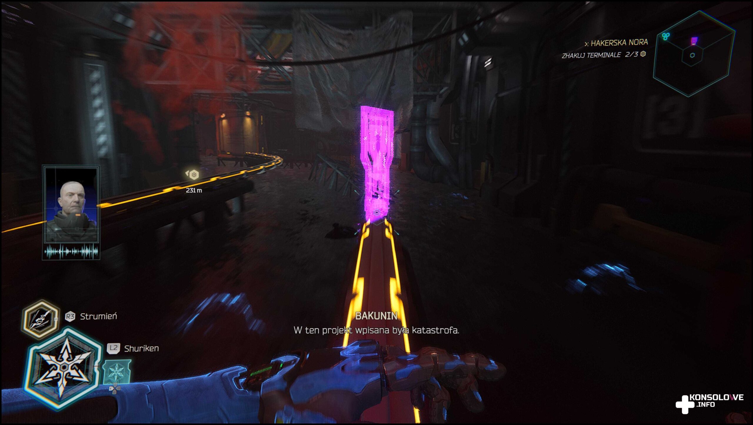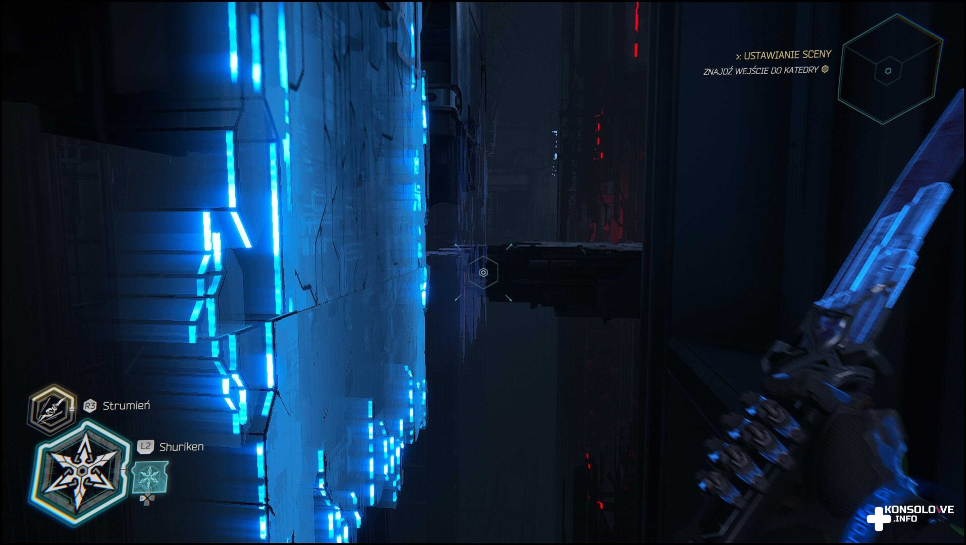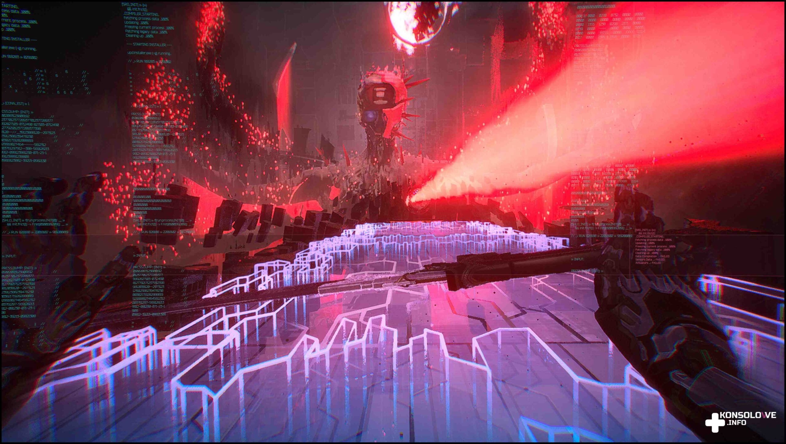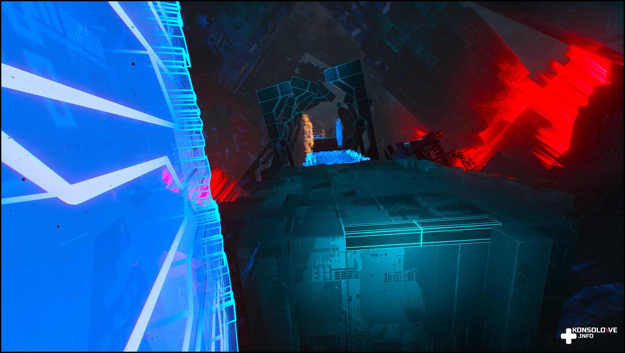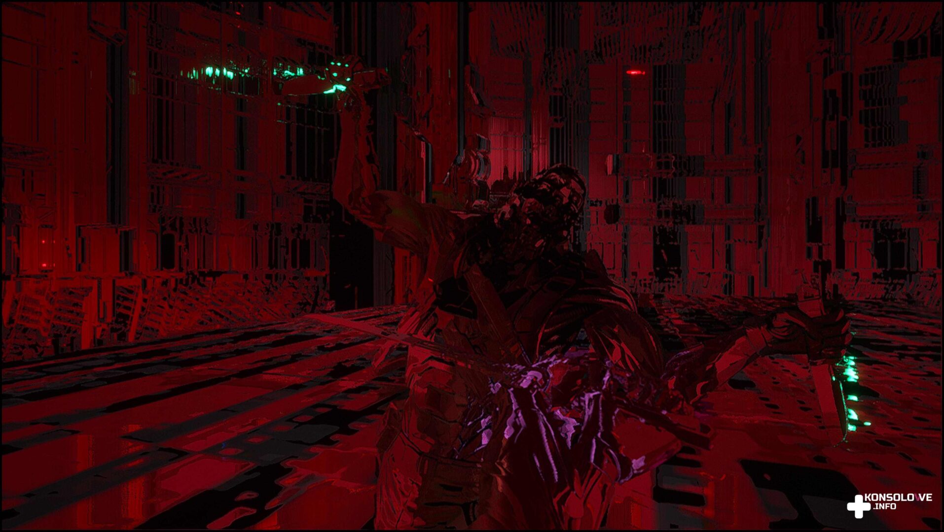 Jako że Ghostrunner 2 jest produkcją, której akcja dzieje się w świecie przyszłości, to nie może zabraknąć pewnego cyberpunkowego elementu. Mam na myśli oczywiście hakowanie. W tej polskiej grze zastosowano zgoła inne podejście niż w dziele CD Projekt RED, Cyberpunku 2077. Fakt faktem, że V przebywał czasem w cyfrowej warstwie. Jednak zdecydowana większość hakowania odbywała się za pomocą odpowiedniego interfejsu i mini-gry. Natomiast One More Level postanowiło podczas każdego hakowania przenieść Jacka do wirtualnej powłoki. W niej naszym zadaniem będzie dotarcie do strumienia danych i (poza kilkoma drobnymi wyjątkami) nie skupimy się na walce. Zamiast tego należy skoncentrować się na wykonywaniu sekwencji platformówkowych i poszukiwaniu dalszej drogi w locie (nierzadko nawet dosłownie).