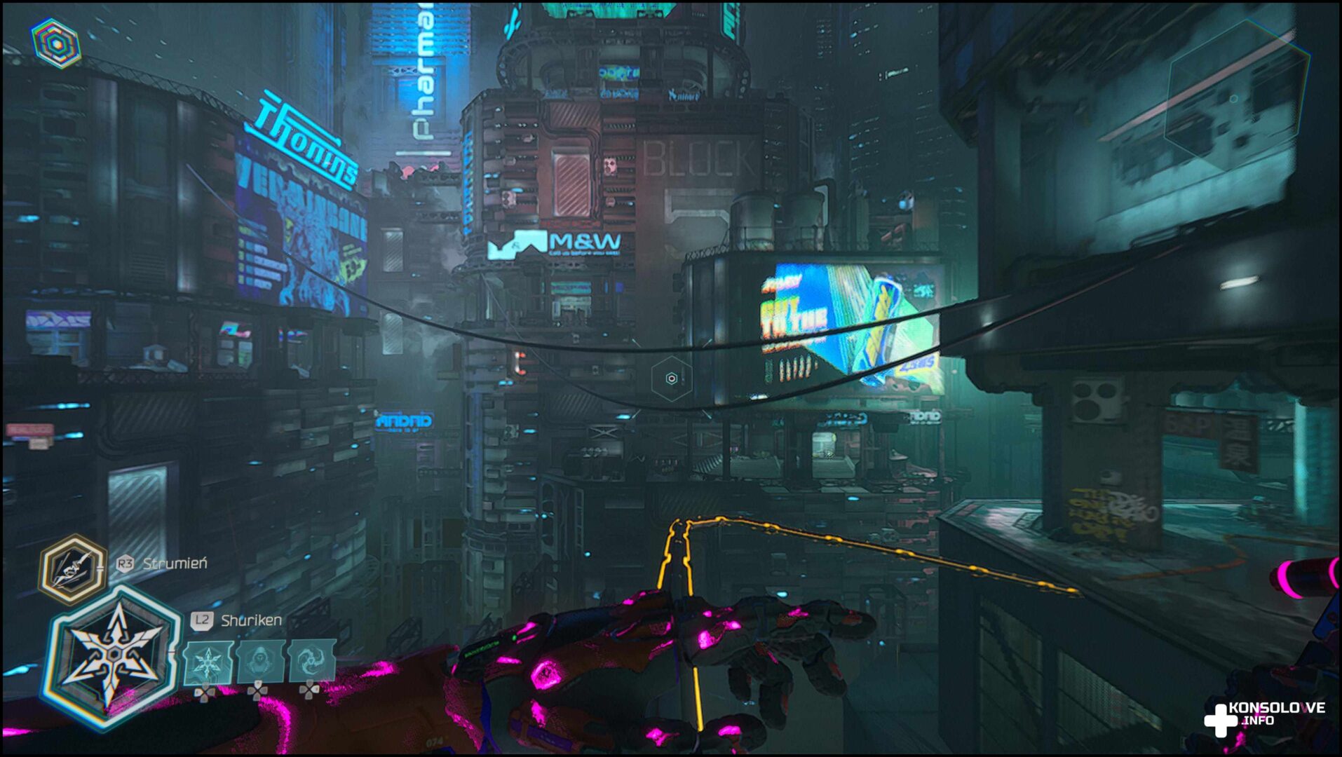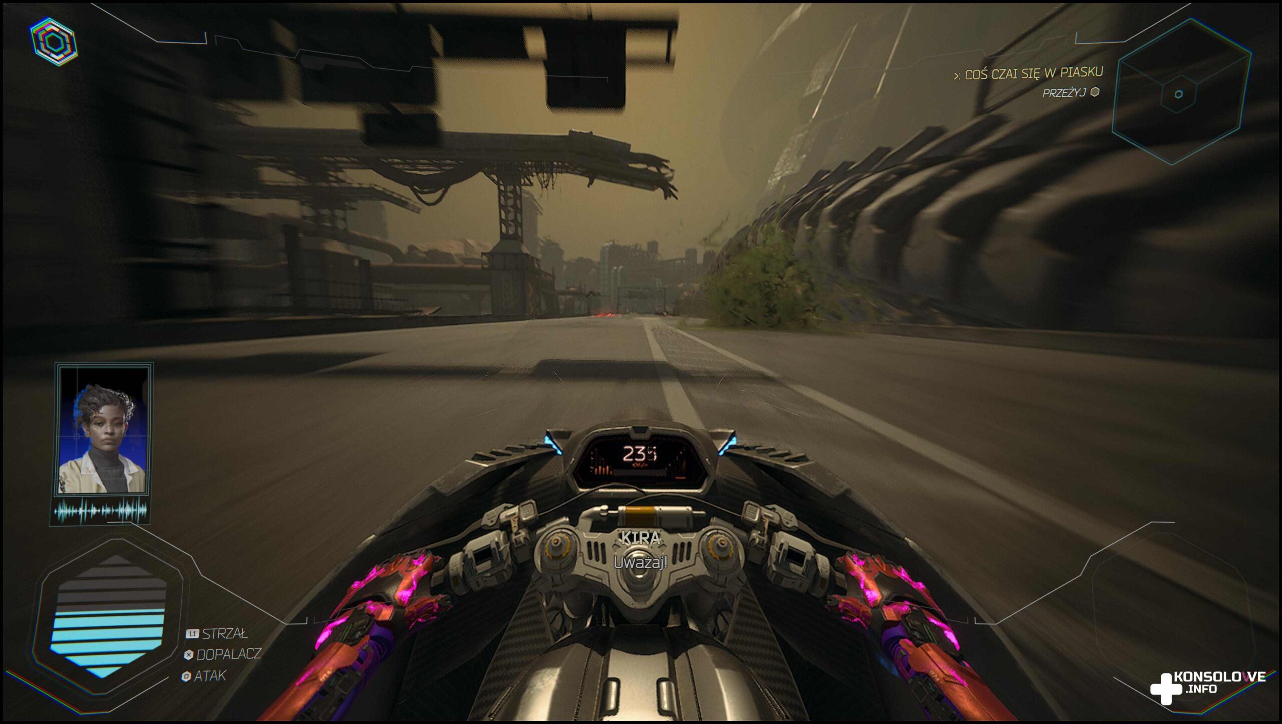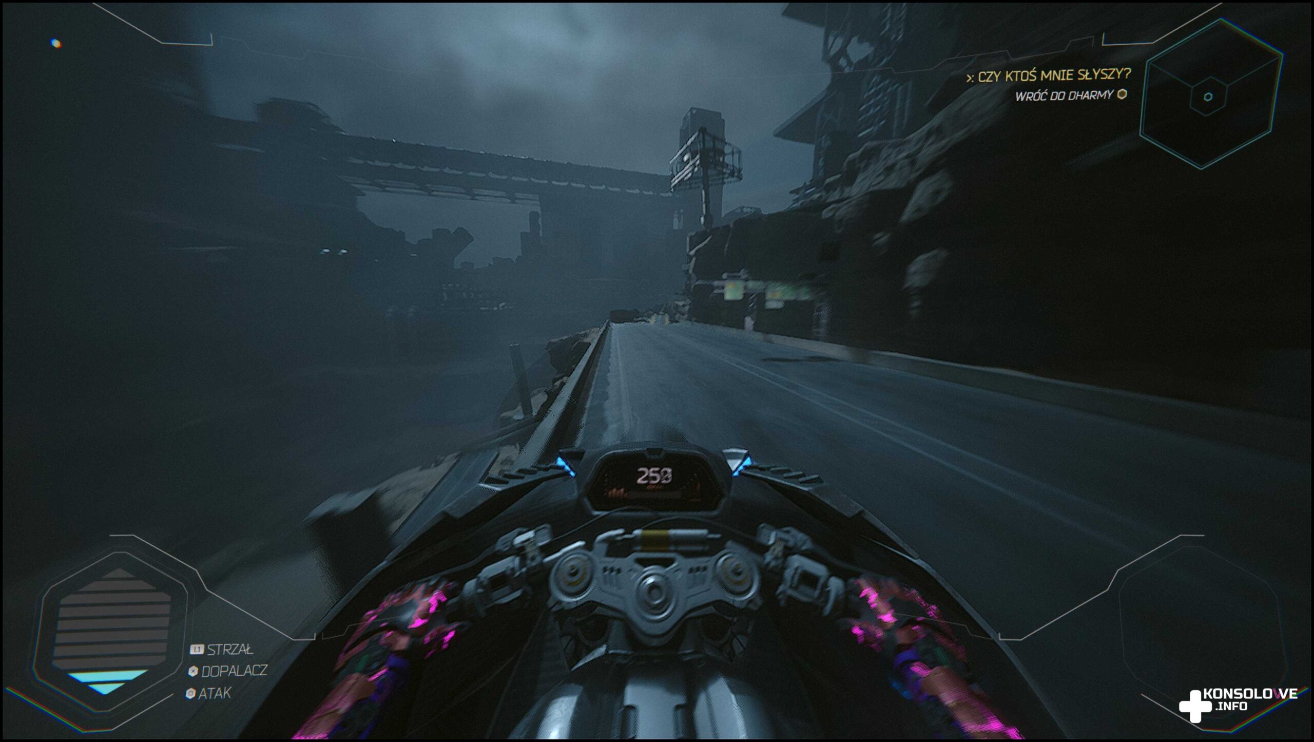 Ghostrunner 2 na ogół wygląda naprawdę obłędnie. Efekty światła czy projekt lokacji często mnie zachwycały i sprawiały, że z ogromną przyjemnością przystawałem, aby się rozejrzeć. Niestety występują też rozmazane tekstury, a i zdarza się – zwłaszcza jeżdżąc motocyklem – wpaść czasem pod teksturę. Technicznie nie jest więc idealnie, ale jest tu jedna kolosalna zaleta – tryb 120 klatek na sekundę! Długo grałem w tę produkcję w 60 klatkach (choć jest też opcja 30 z wyższą rozdzielczością). Kiedy jednak przełączyłem na 120 FPS, to od razu stwierdziłem, że właśnie tak zamierzam grać – zwłaszcza, że nie widziałem różnicy w grafice między 120, a 60 klatkami. Oczywiście czasy wczytywania są błyskawiczne, co na pewno jest zasługą dysków SSD. Nie mogę się też przyczepić do udźwiękowienia. Odgłosy sunięcia po rynnach, czy wyprowadzanych ciosów i wybuchów są bardzo dobrze zrealizowane. Podobnie jak muzyka – mimo że gatunkowo nie wpisuje się w mój gust, to jednak brzmi odpowiednio „cyberpunkowo”. Nie ma się co dziwić – przecież jednym z kompozytorów jest Arkadiusz Reikowski.