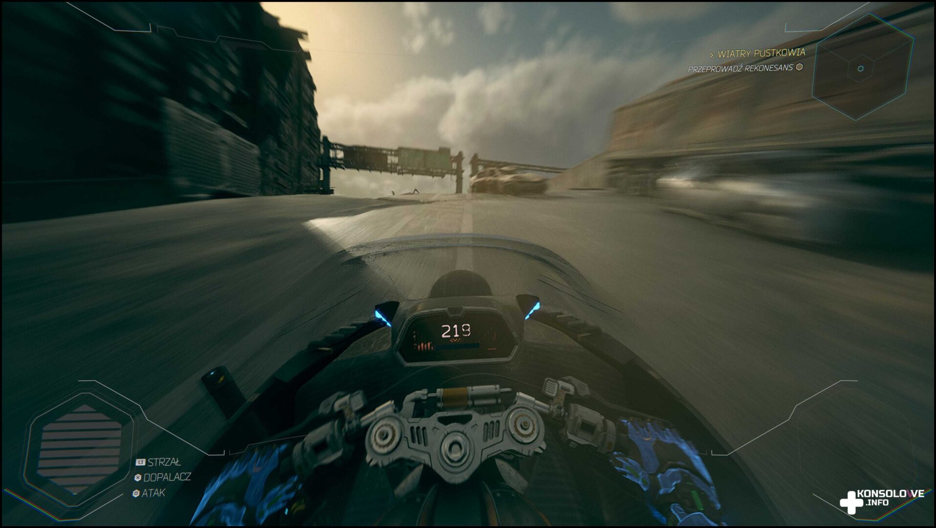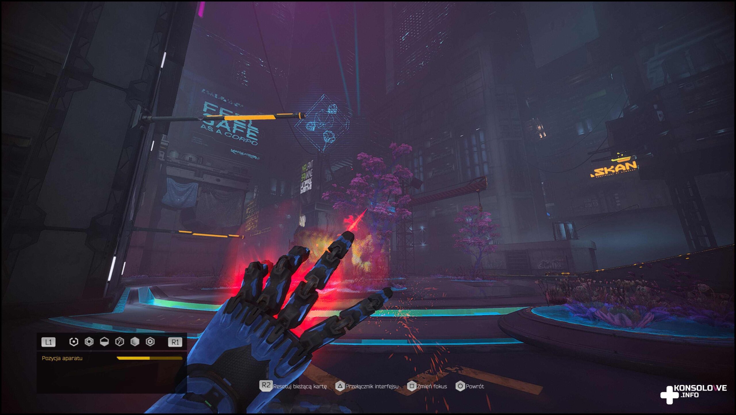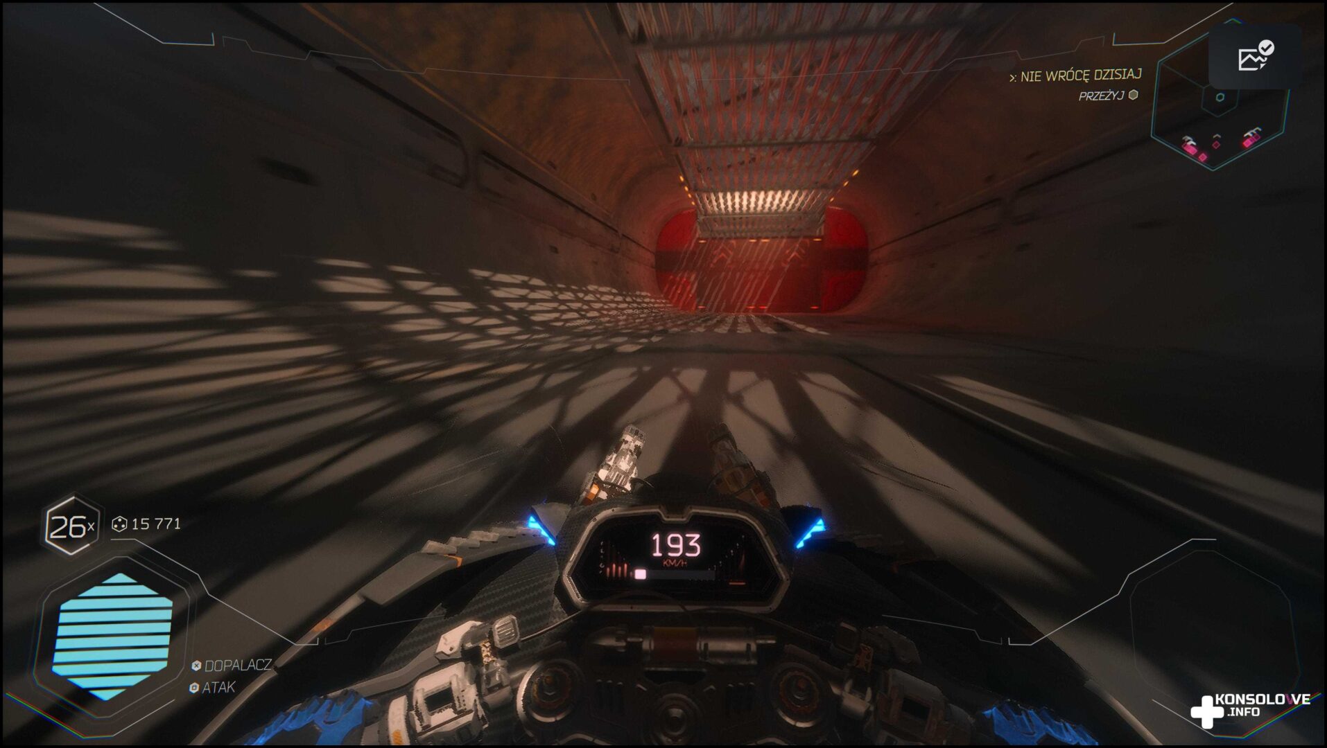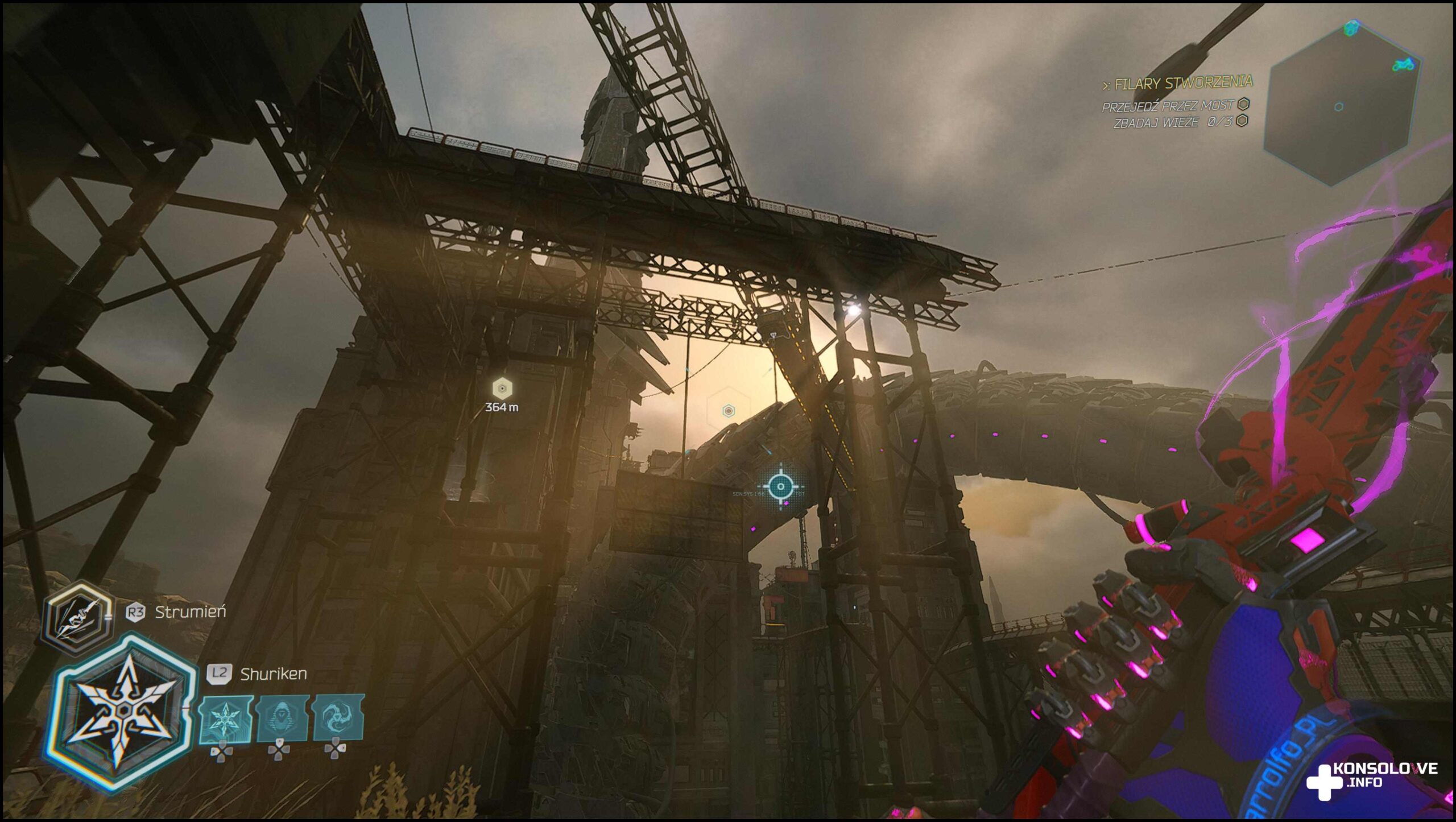 Ghostrunner 2 na ogół wygląda naprawdę obłędnie. Efekty światła czy projekt lokacji często mnie zachwycały i sprawiały, że z ogromną przyjemnością przystawałem, aby się rozejrzeć. Niestety występują też rozmazane tekstury, a i zdarza się – zwłaszcza jeżdżąc motocyklem – wpaść czasem pod teksturę. Technicznie nie jest więc idealnie, ale jest tu jedna kolosalna zaleta – tryb 120 klatek na sekundę! Długo grałem w tę produkcję w 60 klatkach (choć jest też opcja 30 z wyższą rozdzielczością). Kiedy jednak przełączyłem na 120 FPS, to od razu stwierdziłem, że właśnie tak zamierzam grać – zwłaszcza, że nie widziałem różnicy w grafice między 120, a 60 klatkami. Oczywiście czasy wczytywania są błyskawiczne, co na pewno jest zasługą dysków SSD. Nie mogę się też przyczepić do udźwiękowienia. Odgłosy sunięcia po rynnach, czy wyprowadzanych ciosów i wybuchów są bardzo dobrze zrealizowane. Podobnie jak muzyka – mimo że gatunkowo nie wpisuje się w mój gust, to jednak brzmi odpowiednio „cyberpunkowo”. Nie ma się co dziwić – przecież jednym z kompozytorów jest Arkadiusz Reikowski.