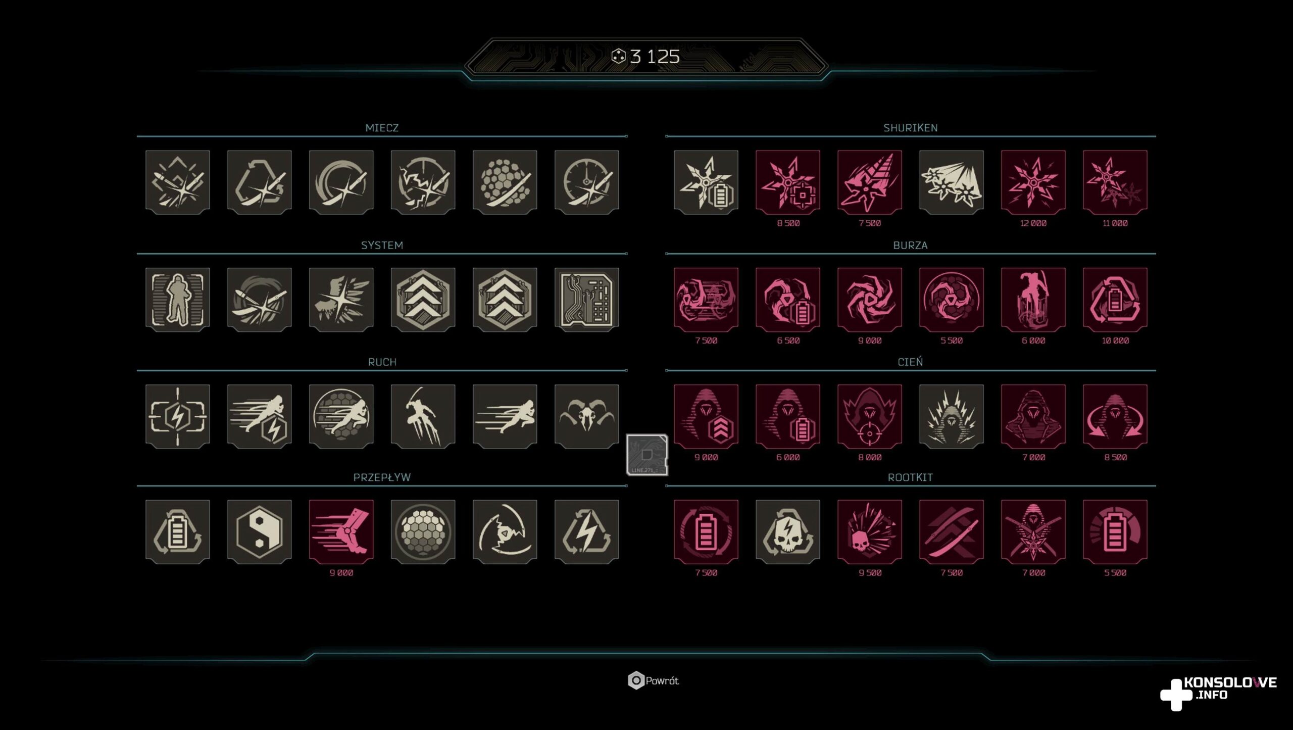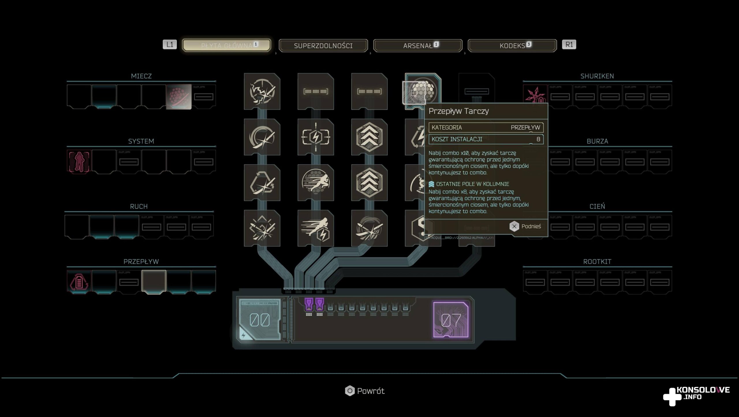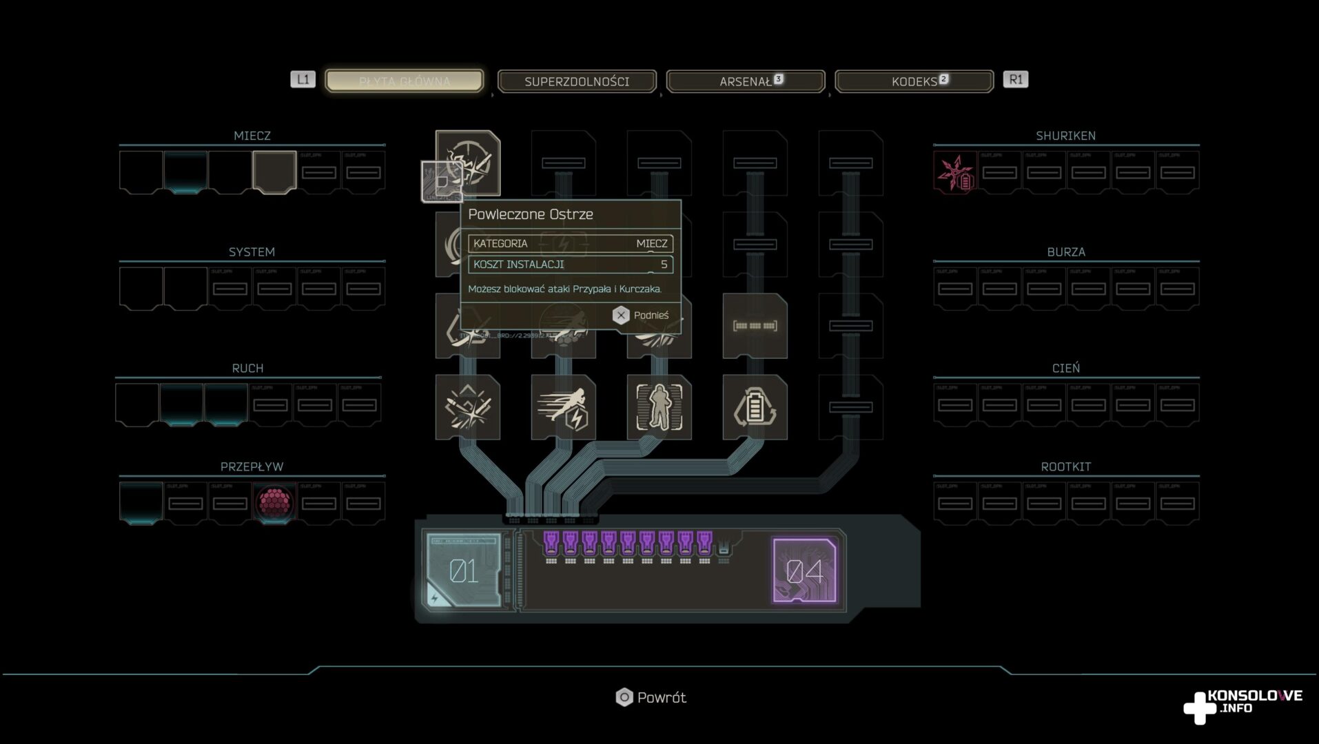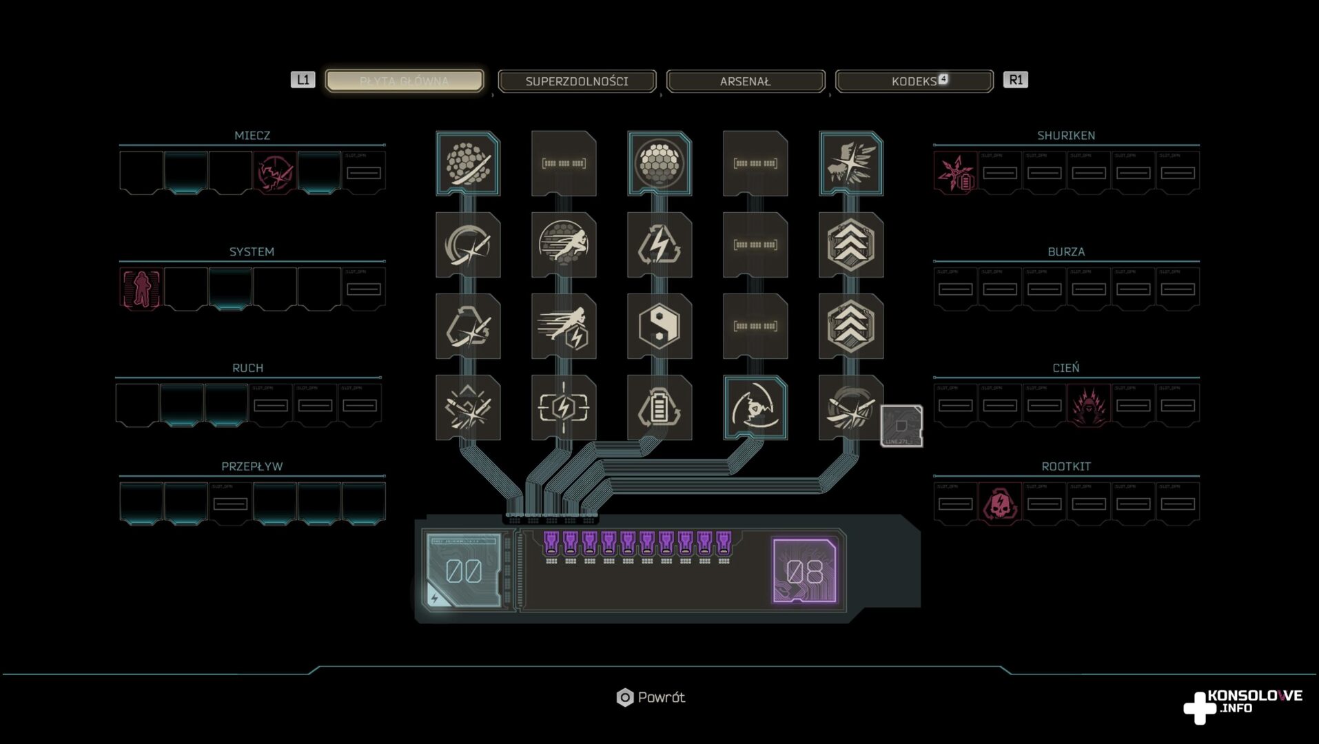 W Ghostrunner 2 nie brakuje elementów znanych z gier RPG. Chodzi mi tu o ulepszanie naszych umiejętności. Przemierzając futurystyczny świat stworzony przez One More Level, możemy natknąć się na specjalne fioletowe znajdźki. Odpowiadają one za rozwinięcie pamięci naszej płyty głównej. Wiąże się z tym bardzo interesująca mechanika. Mianowicie, mamy do dyspozycji kilka gniazd. I teraz zaczyna się najlepsze. Każda umiejętność, czy też ulepszenie, ma określony typ oraz koszt instalacji. Oznacza to, że w jednej kolumnie możemy umieścić tylko ulepszenia na przykład systemu, poruszania się, katany czy rootkita. Co więcej, niektóre umiejętności mają dodatkowe premie aktywowane przez umieszczenie ich na ostatnim miejscu kolumny, gdy są otoczone innymi umiejętnościami albo gdy nie ma niczego obok tej zdolności. Wprowadza to trochę logicznego myślenia do zarządzania umiejętnościami.