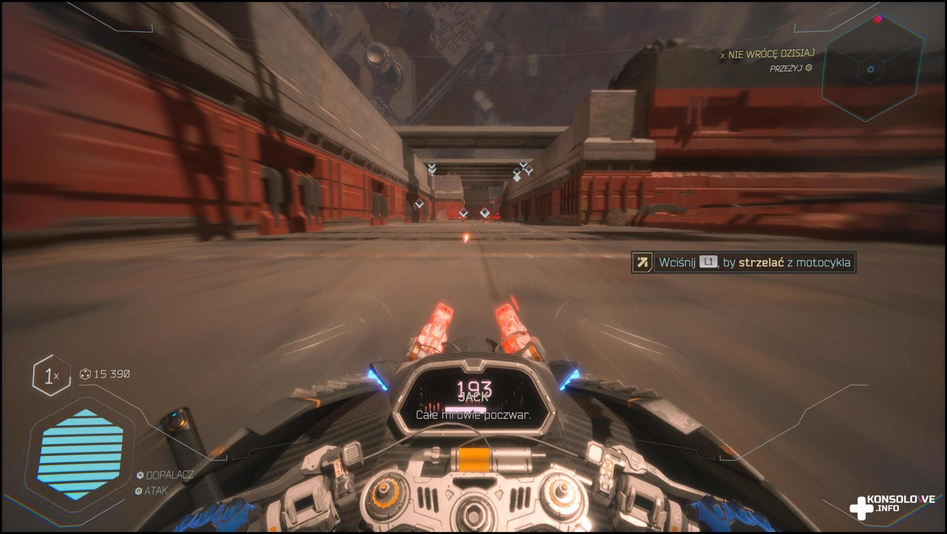 Wracając jednak do motocykla, to zsiądziemy z niego nieraz, aby otworzyć przejścia dla pojazdu, a jadąc na nim, oddamy strzały z zamontowanych na nim działek (po naciśnięciu L1). Unikniemy też pola laserów, zeskakując z motocykla i jeszcze w powietrzu przyciągając się do niego (naciskając kwadrat). Przejedziemy również po ścianach i skorzystamy z doładowania, aby przeskoczyć z ramp na spore odległości. Motocykl jest świetny i zawsze lubiłem na niego wsiadać. Warto zaznaczyć, że on również ma alternatywne skórki.