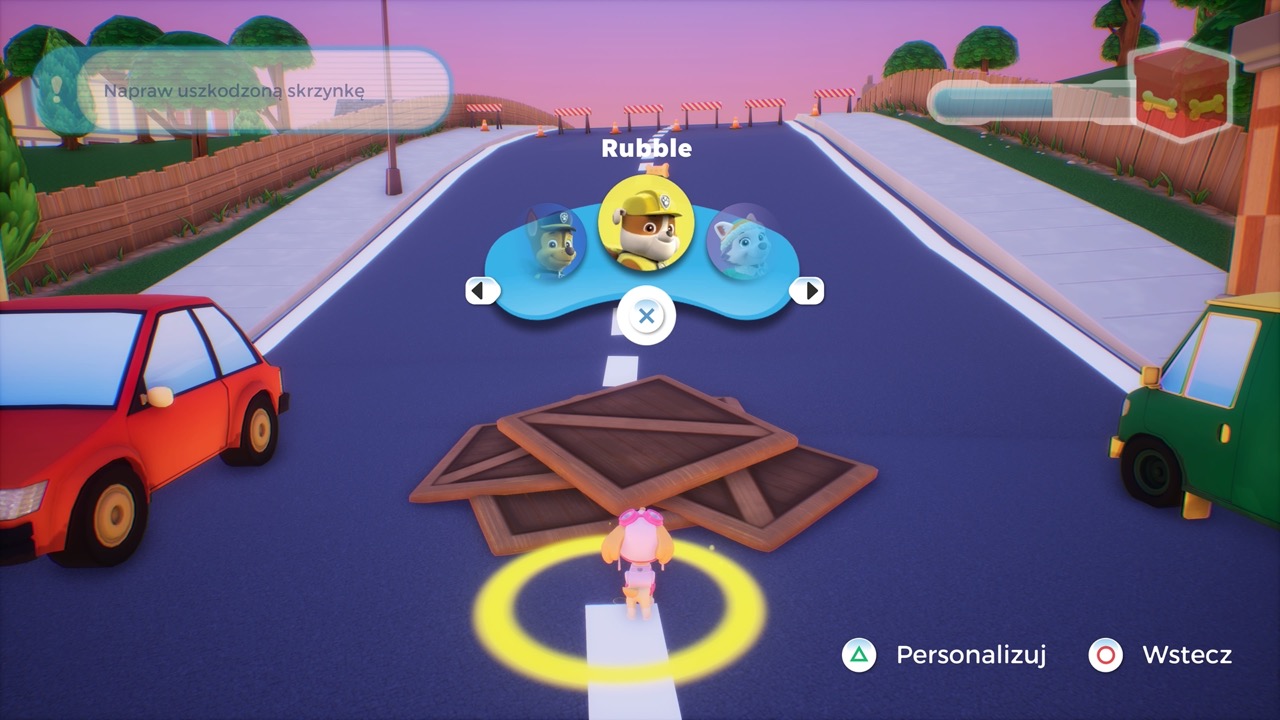 Zebrane przysmaki napełniają specjalny pasek. Po jego zapełnieniu odblokowujemy nową naklejkę lub gadżet dla naszych psów. Możemy w ten sposób przebrać każdego bohatera w nowy, śmieszny strój, a także osobno ozdobić jego pojazd. Dzieci będą miały sporo rzeczy do wyboru, bo nowe elementy odblokowuje się co chwila.