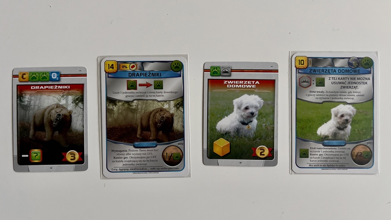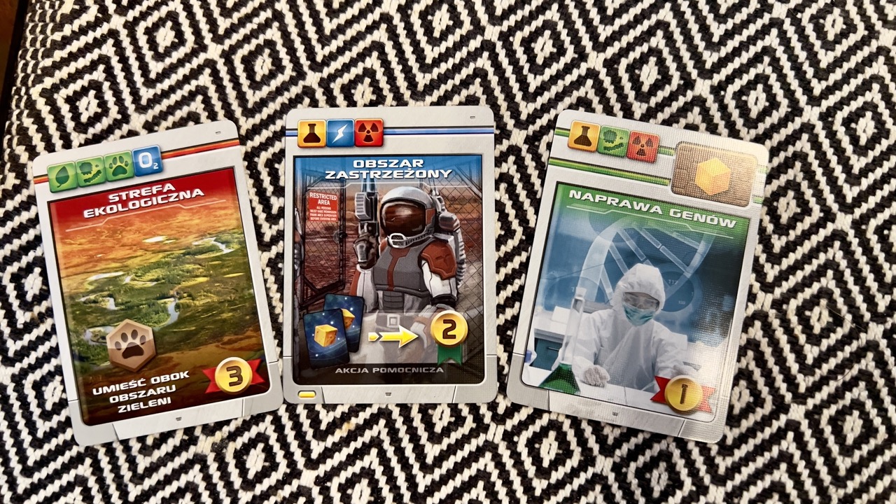 Dla przykładu poniżej zobaczycie 3 różne karty. W lewym górnym rogu jest wspomniany koszt ich zagrania. Jeśli zdecyduję się zagrać zieloną kartę Naprawy Genów, to w następnej turze produkcji będę mógł rzucić dodatkową żółtą kością. Karta ta da mi też 1 punkt zwycięstwa na koniec gry. Czerwona karta Strefa Ekologiczna daje natychmiastowy efekt w postaci umieszczenia na planszy znacznika z łapą, a graczowi na koniec gry doda 3 punkty zwycięstwa. Ostatnia, niebieska karta Obszaru Zastrzeżonego dodaje dla gracza dodatkową akcję pomocniczą — pozwala odrzucić dwie karty, aby zyskać natychmiast 2 punkty zwycięstwa.