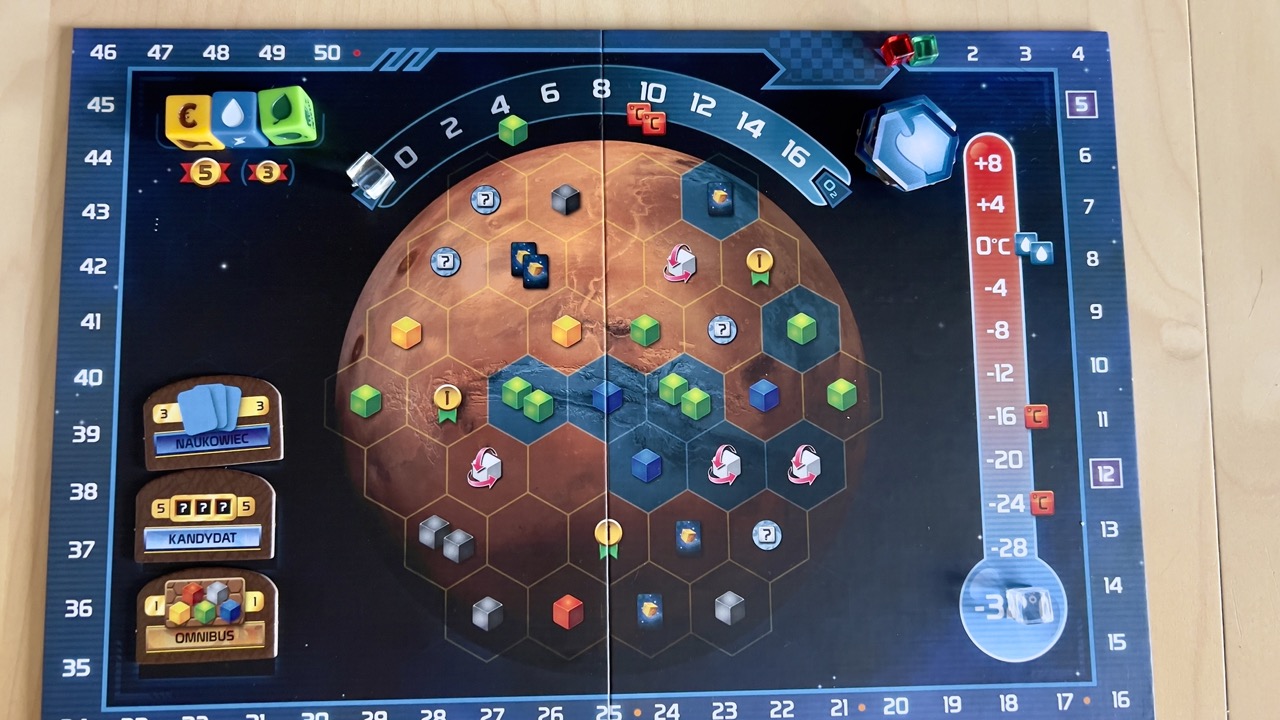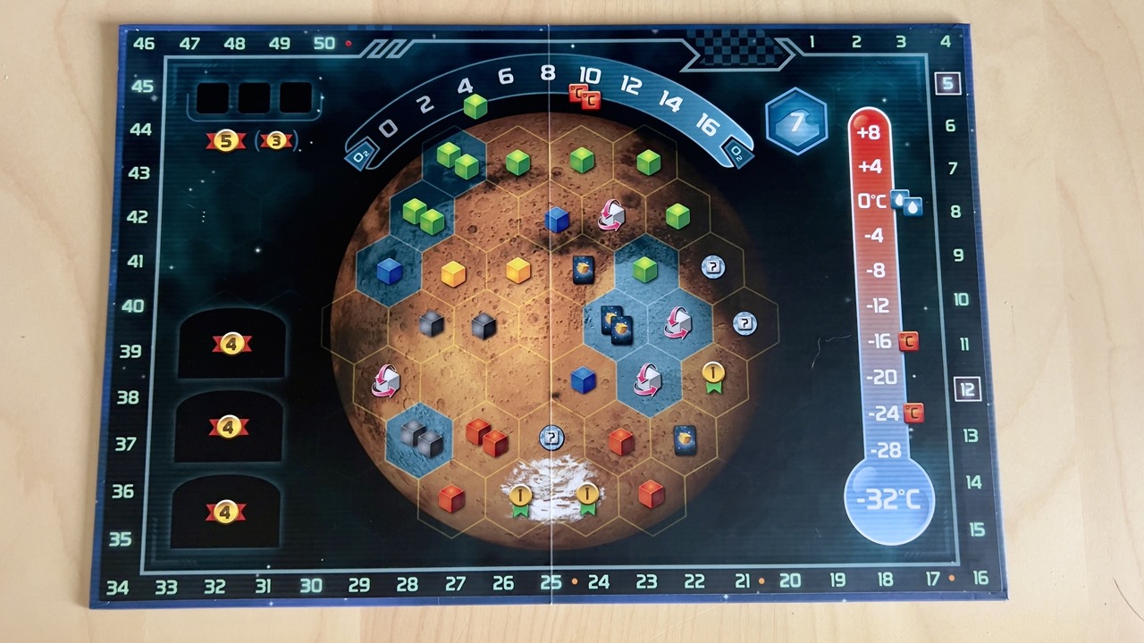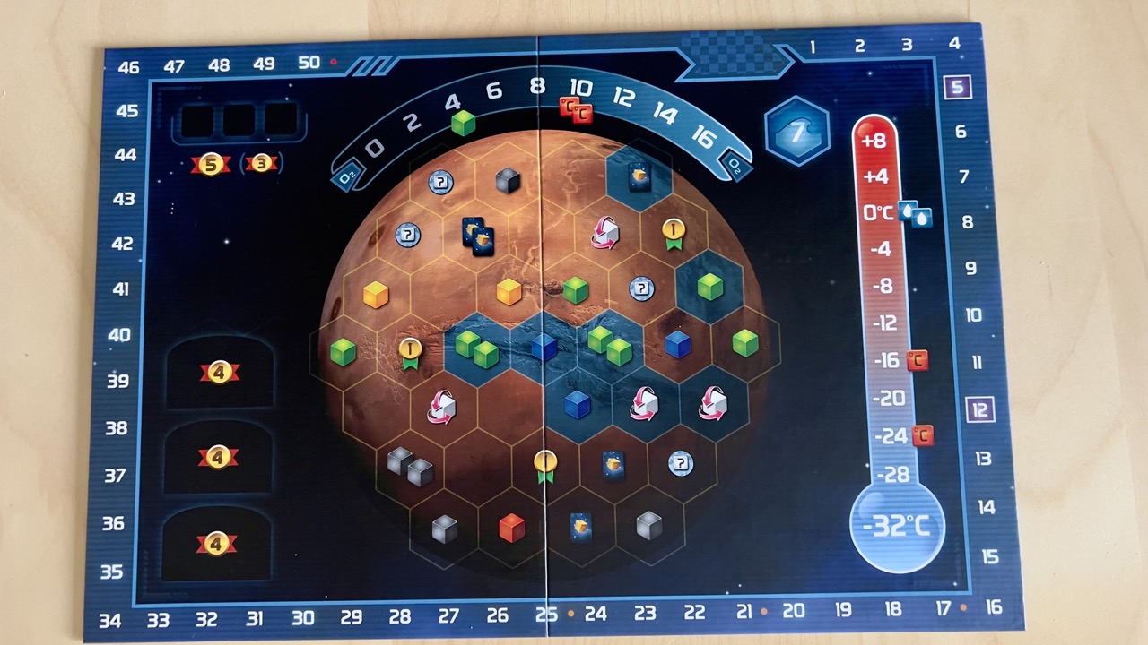 Sama plansza z grą jest dwustronna, przedstawia dwie różne części Czerwonej planety. Możemy więc zdecydować którą wersję zagramy. Na środku znajdziemy mapę Marsa. Na górze i z prawej strony znajdziemy odpowiednio tor poziomu tlenu oraz temperatury. Z lewej strony przygotowano miejsca na nagrody dla graczy, a całość opleciona jest torem punktacji.