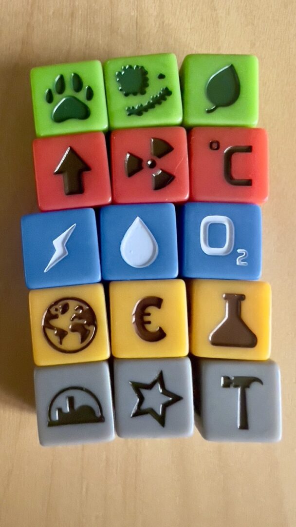 Na sam koniec zostawiam główne danie, czyli zestaw 60 kości. Są one podzielone na grupy po 12 kości w 5 różnych kolorach. Kości w ramach każdej grupy są identyczne, i będą nam potrzebne do wykonania większości czynności w grze.