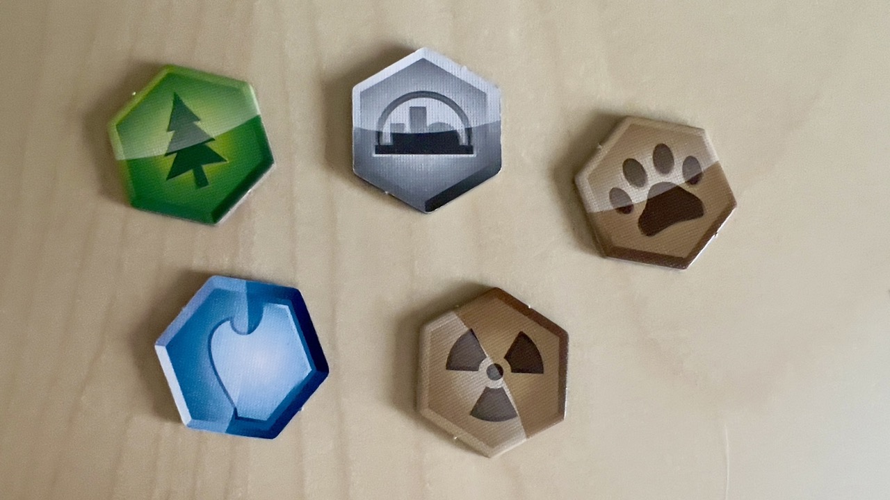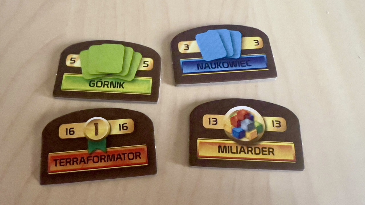 Kolejne żetony to znane z gier z serii tytuły. Jest ich całkiem sporo i w przeciwieństwie do podstawowej wersji gry nie są nadrukowane na stałe na planszy. Zamiast tego w każdej rozgrywce losujemy 3 i umieszczamy w odpowiednim miejscu. Ostatnie żetony to zasoby uniwersalne, które możemy wykorzystać jako dowolny zasób do zagrania karty.