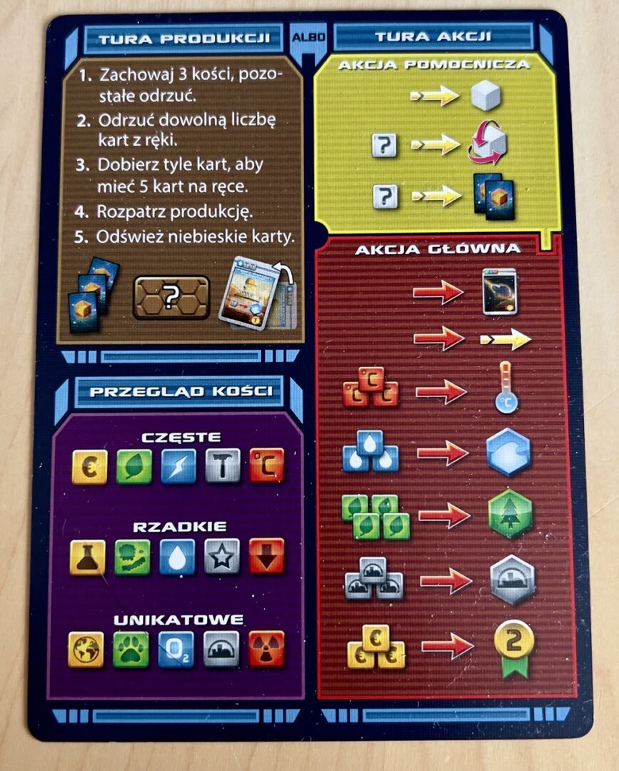 Pozostałe akcje główne pozwalają wydać określone kości na zbudowanie miasta czy zwiększenie parametrów planety. Wszystko przejrzyście opisane jest na karcie pomocy.
