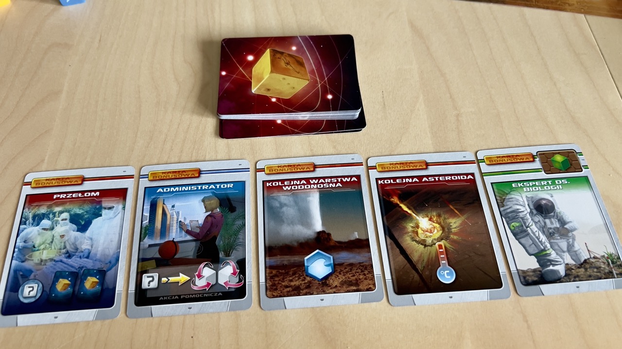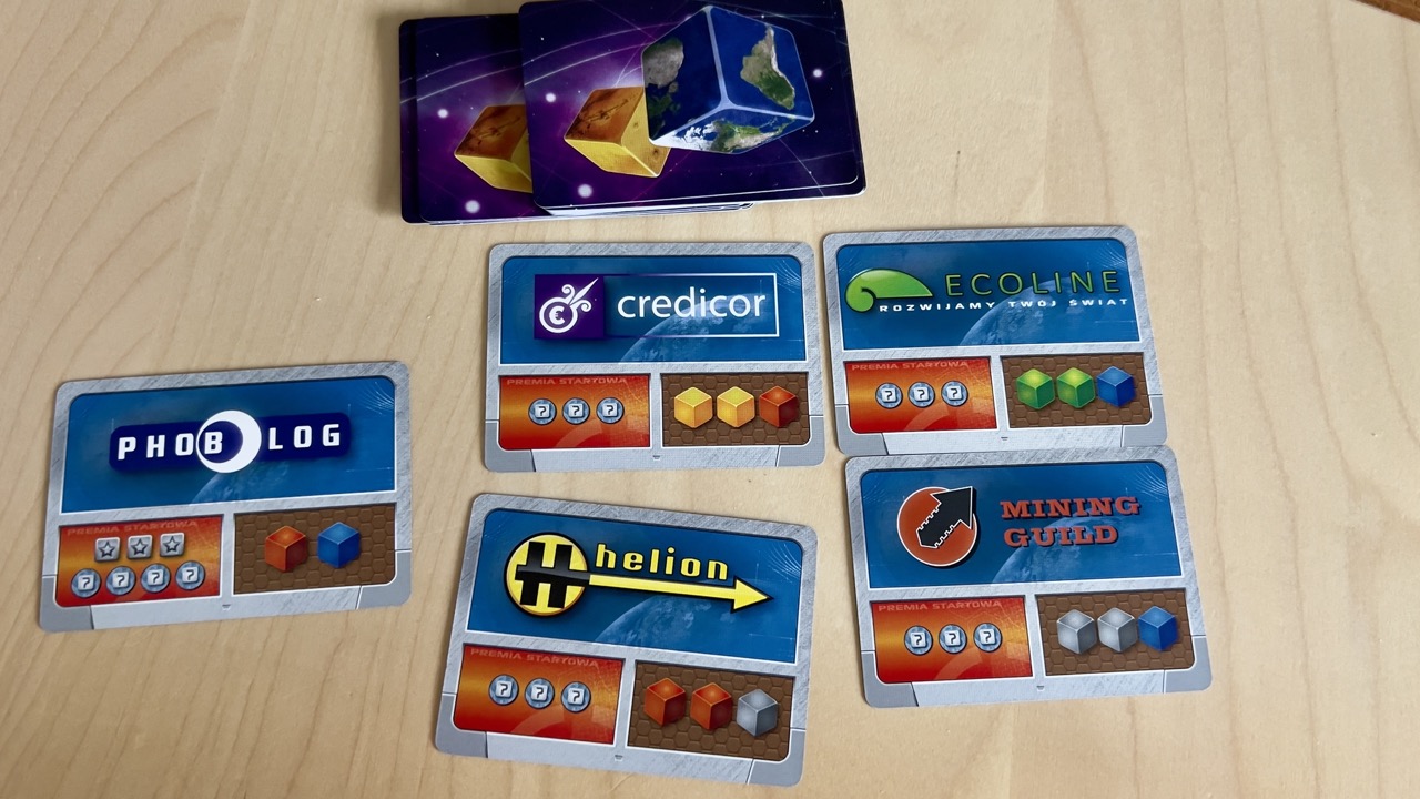 Podobnie jak w innych grach z serii znajdziemy tutaj też pakiet kart. Podzielić je można na 3 talie. Pierwsza to karty projektów, druga to talia kart korporacji. Obie doskonale znane wszystkim terraformatorom. Trzecią talią kart są karty bonusowe. O działaniu poszczególnych kart opowiem w dalszej części recenzji.