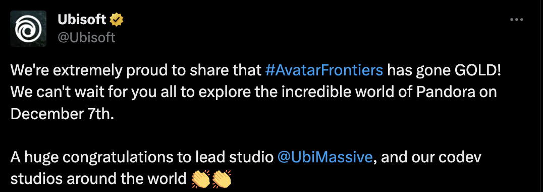 Ubisoft ogłosił, że gra Avatar: Frontiers of Pandora uzyskała złoty status. To oznacza, że główne prace nad grą są już zakończone i tytuł jest gotowy do premiery. Nic już więc nie stanie na przeszkodzie, by gracze mogli zacząć zwiedzać Pandorę na początku grudnia. Gra zadebiutuje na konsolach PS5 oraz Xbox Series S i X, a także na PC 7 grudnia 2023 roku.