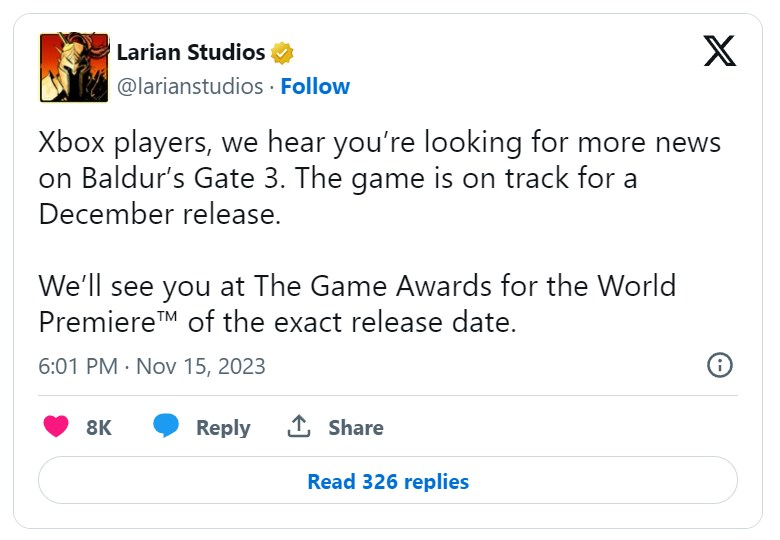 Deweloperzy ze studia Larian są ostatnio bardzo aktywni na Twitterze. W jednym z ostatnich tweetów deweloper zachęca graczy do oglądania gali The Game Awards, która odbędzie się 7 grudnia. Transmisja będzie oczywiście dostępna między innymi na YouTube oraz Twitchu. W trakcie show w jednym z okienek „World Premiere” poznamy datę wydania Baldur’s Gate 3 na konsole Xbox Series X|S.
