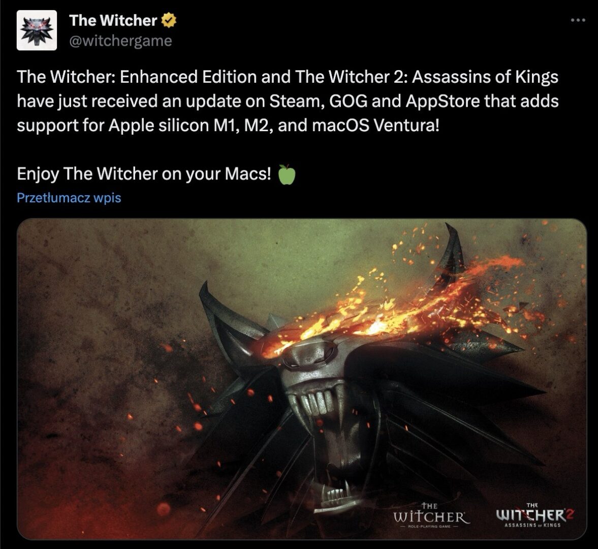 CD Projekt Red pochwaliło się, że dwie pierwsze odsłony Wiedźmina są od dziś kompatybilne z komputerami wyposażonymi w procesory z rodziny M. Odpowiednie aktualizacje gier trafiły już na GOG, Steam i AppStore. Jeśli więc macie te gry w swojej bibliotece, to możecie sprawdzić jak sprawują się na Mac OS.