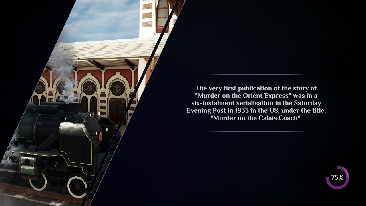 Ekrany ładowania naszpikowane są ciekawostkami o życiu i twórczości Agathy Christie. Trochę uprzyjemnia to czekanie, szczególnie w wersji na Switcha. Zakładam, że na PlayStation 5 czy Xbox Series wygląda to zupełnie inaczej i rzadko kiedy będziemy mieć do czynienia z ekranami ładowania. Chociaż, nawet na Switchu nie wygląda to źle – dłuższe ekrany ładowania zobaczymy jedynie przy kolejnych rozdziałach, kiedy zmienia się sceneria.