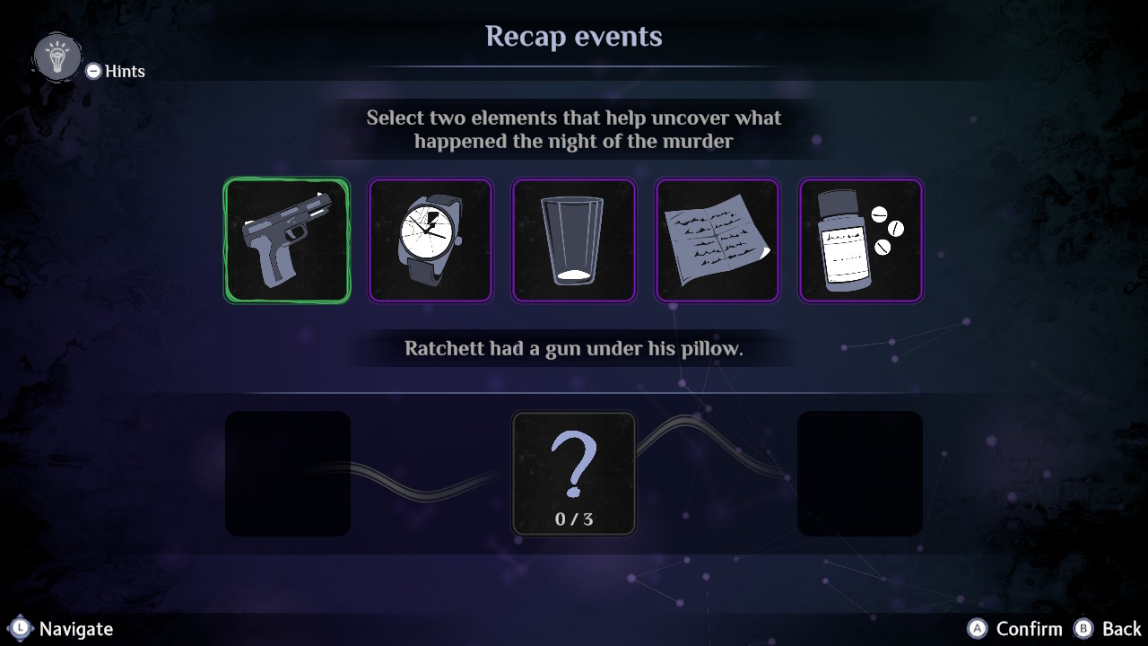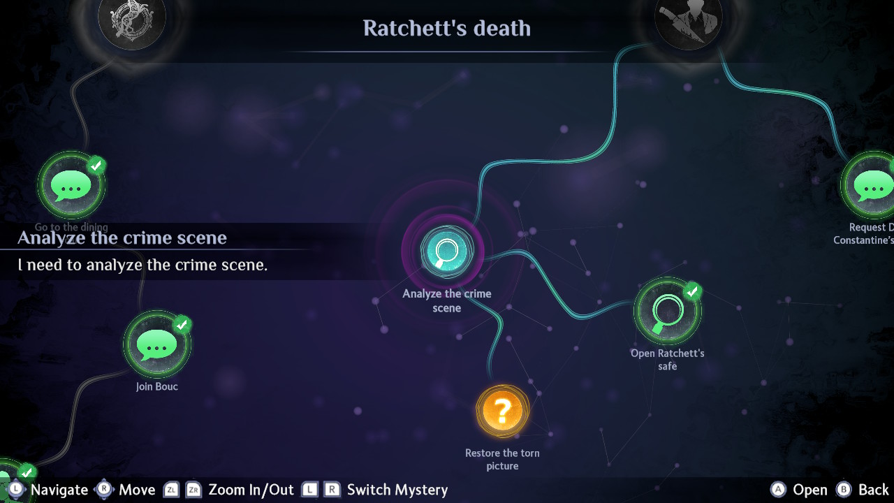 Jako Poirot mamy bardzo dużo swobody, możemy chodzić i zaglądać prawie wszędzie. Samo klikanie po przedmiotach jest zmapowane na Switchu do przycisku A, co oczywiście, jako osobie przyzwyczajonej do Xboxa, przysparzało na początku sporo kłopotów. Wszystko jest jednak bardzo logiczne, mamy też szybki dostęp do niektórych zakładek naszej mapy umysłów – znajdziemy tam takie sekcje jak opisy postaci, czy możliwość zerknięcia kolejny raz w zebrane notatki.